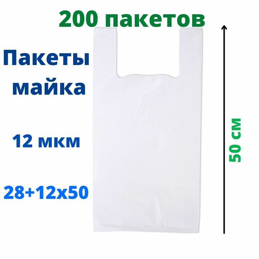 Купить Пакеты майка 200 штук 28+12(боковая складка)х50 см белая 12 мкм