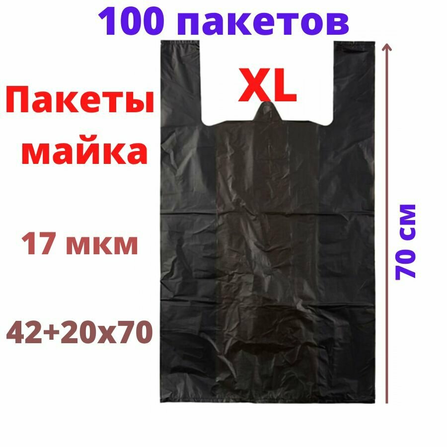 Купить Пакеты майка 100 штук 42+20(боковая складка)х70 см чёрные 17 мкм
