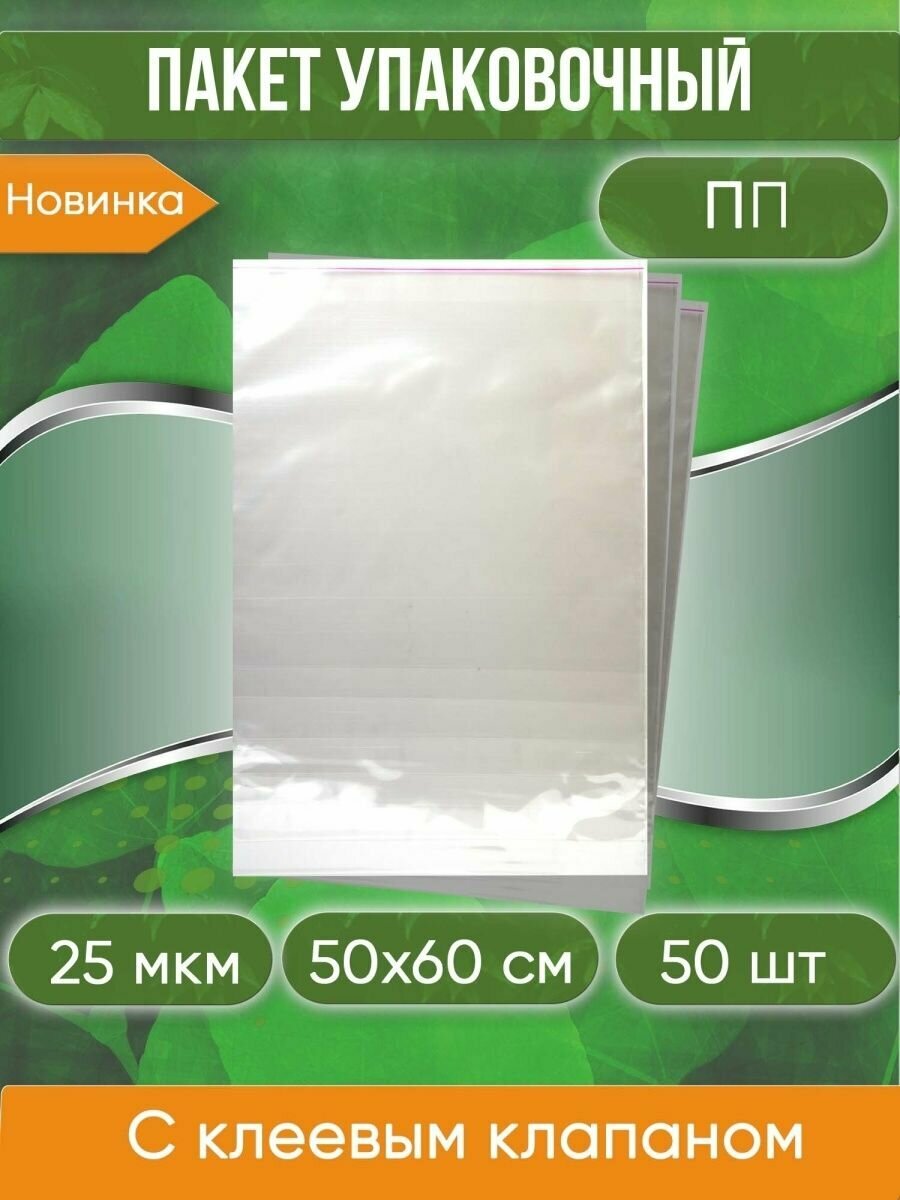 Пакет упаковочный ПП с клеевым клапаном, 50х60+5 см, 25 мкм, 50 шт. интересное: