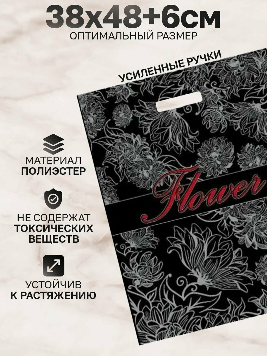 Пакеты "Флористик" с прорубной ручкой, пакет полиэтиленовый с ручками, 38х48+6 см, 50 мкм, черный, 50 шт. интересное: