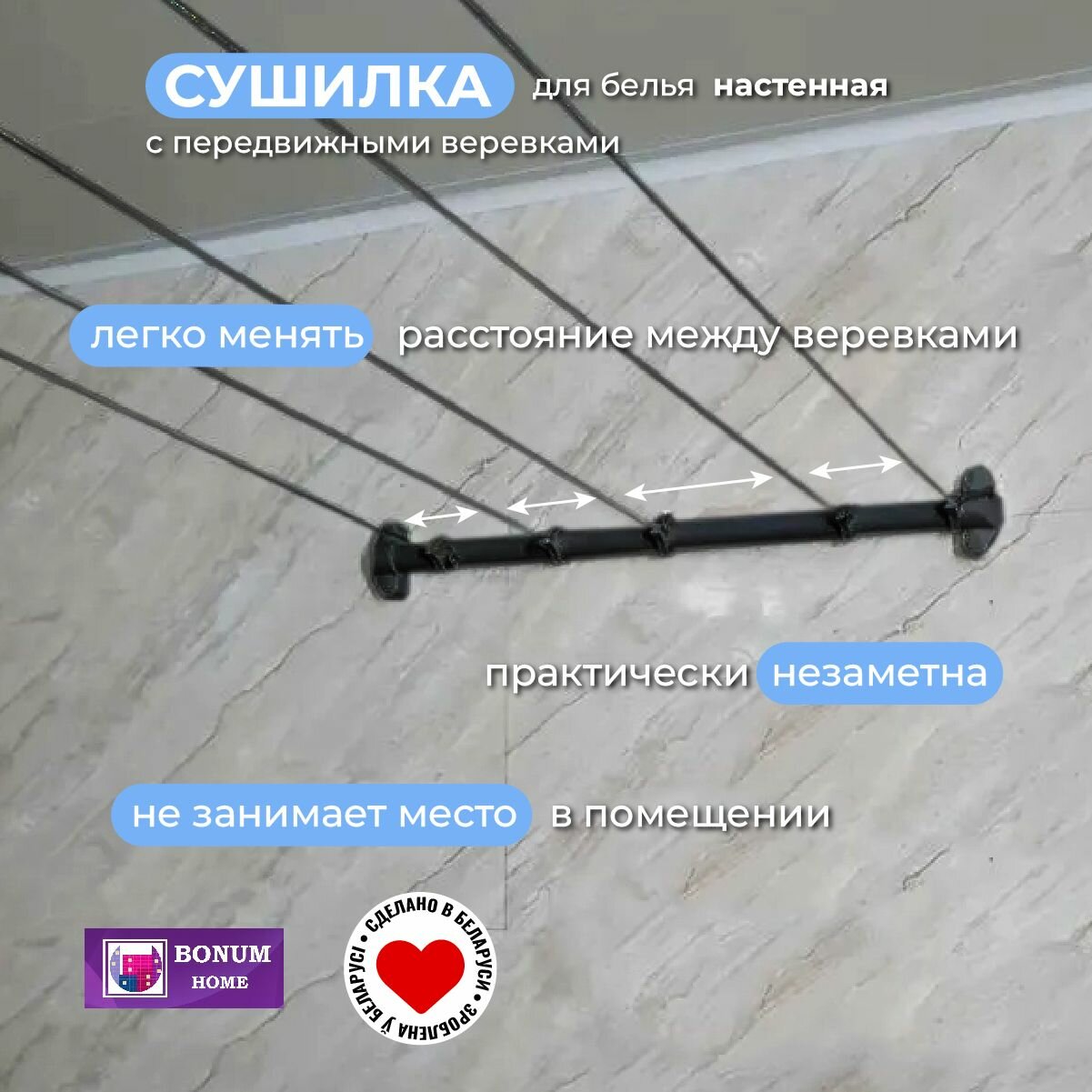 Сушилка настенная с 5 передвижными веревками, белая. Беларусь.