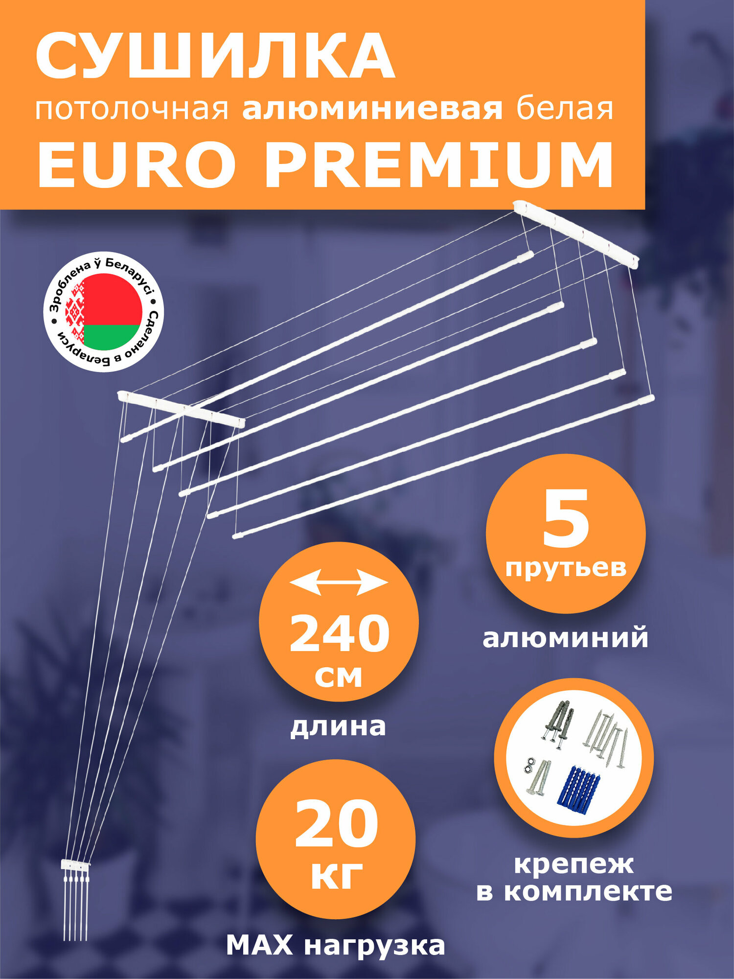 Купить Сушилка д/белья потолочная белая 2,4 м. EURO PREMIUM алюминиевая 5 прутьев