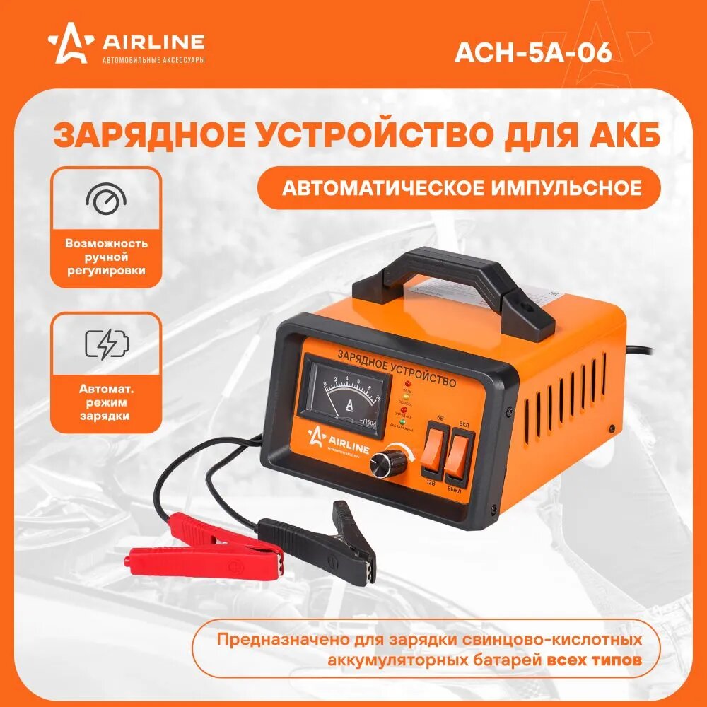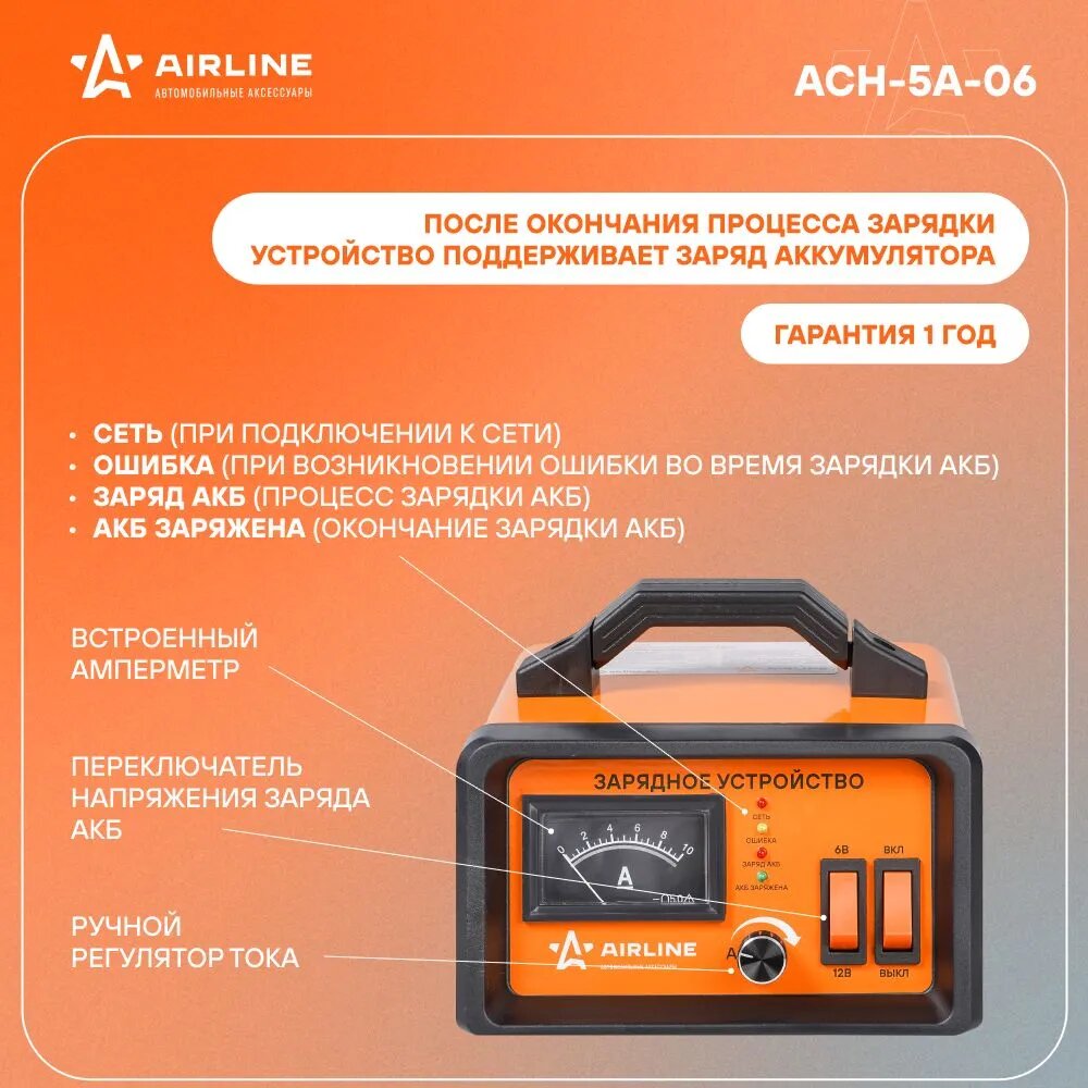 AIRLINE Зарядное устройство Airline, 5А, 6В / 12В, амперметр ACH-5A-06