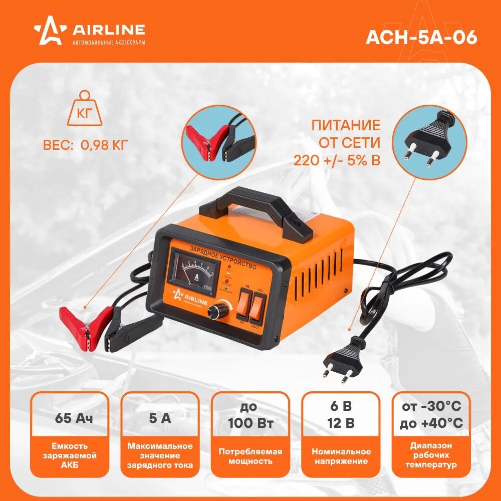 Устройство зарядное Airline, автоматический режим, с функцией амперметра, 6/12В, до 65Ач, ток заряда до 5А, для WET, EFB, арт. ACH-5A-06