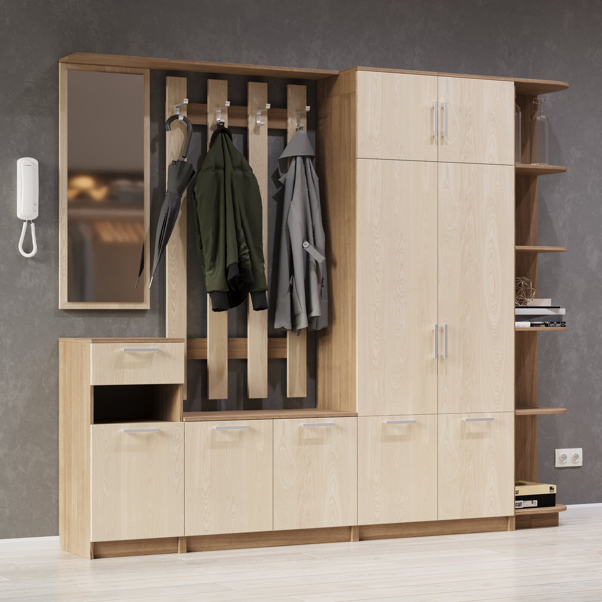 Прихожая комплект САША-6 (правая) от Фант-Мебель, с зеркалом, с обувницей, шкафом и ящиками, 156x203,6x43 см. Ясень темный/Ясень светлый