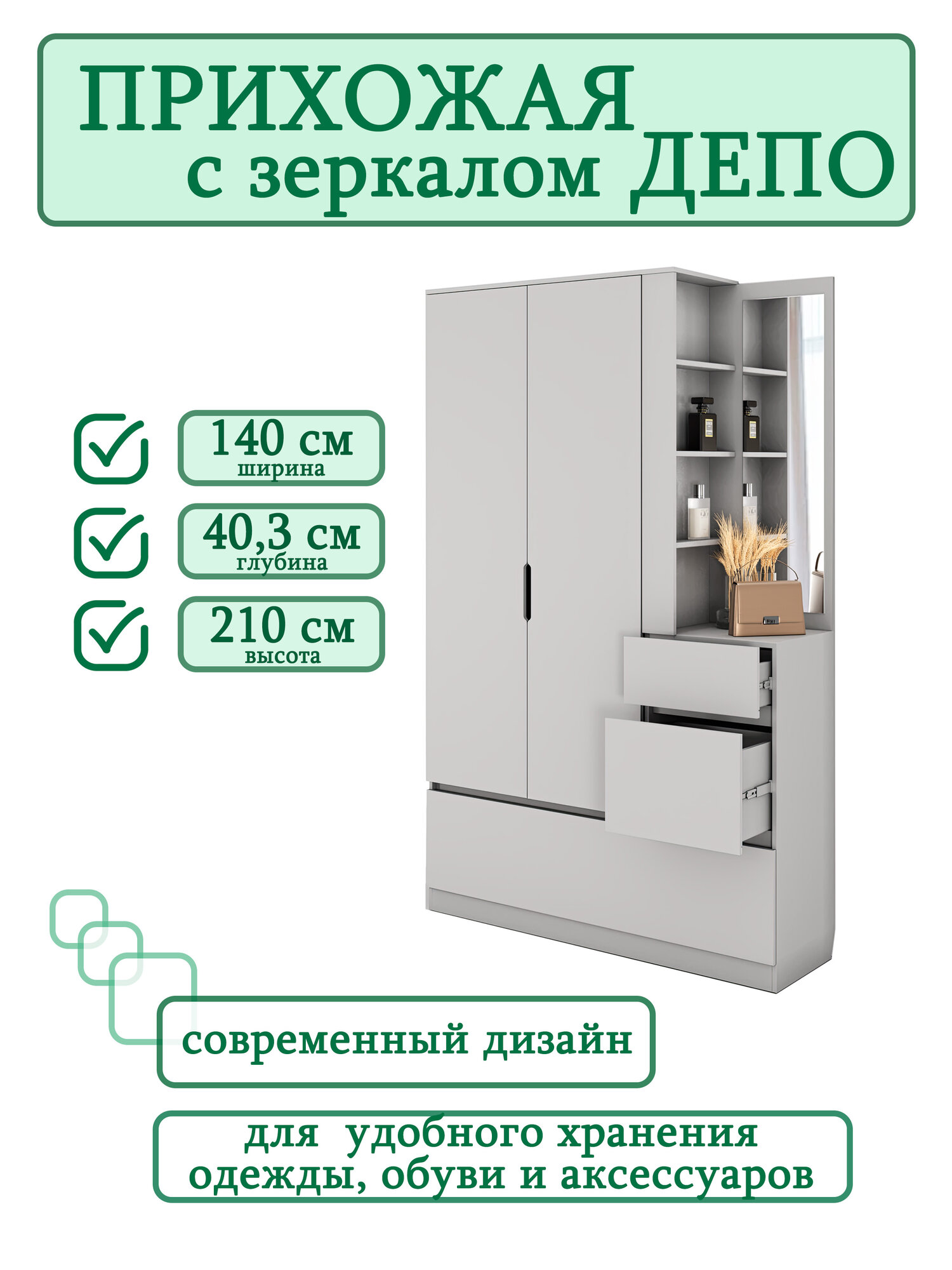 Есэндвич Депо Прихожая, 140х210х40 см (Белый), с зеркалом, со штангой и ящиками