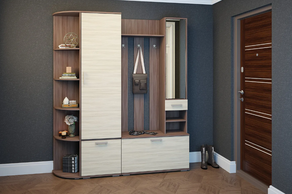 Прихожая комплект САША-6 (правая) от Фант-Мебель, с зеркалом, с обувницей, шкафом и ящиками, 156x203,6x43 см. Ясень темный/Ясень светлый