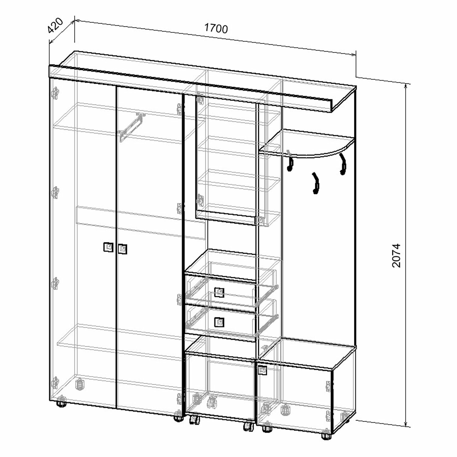 Купить Прихожая Агат 6 с зеркалом цвет: ясень шимо темный/ясень шимо светлый размер: 1700х420х2074 мм.