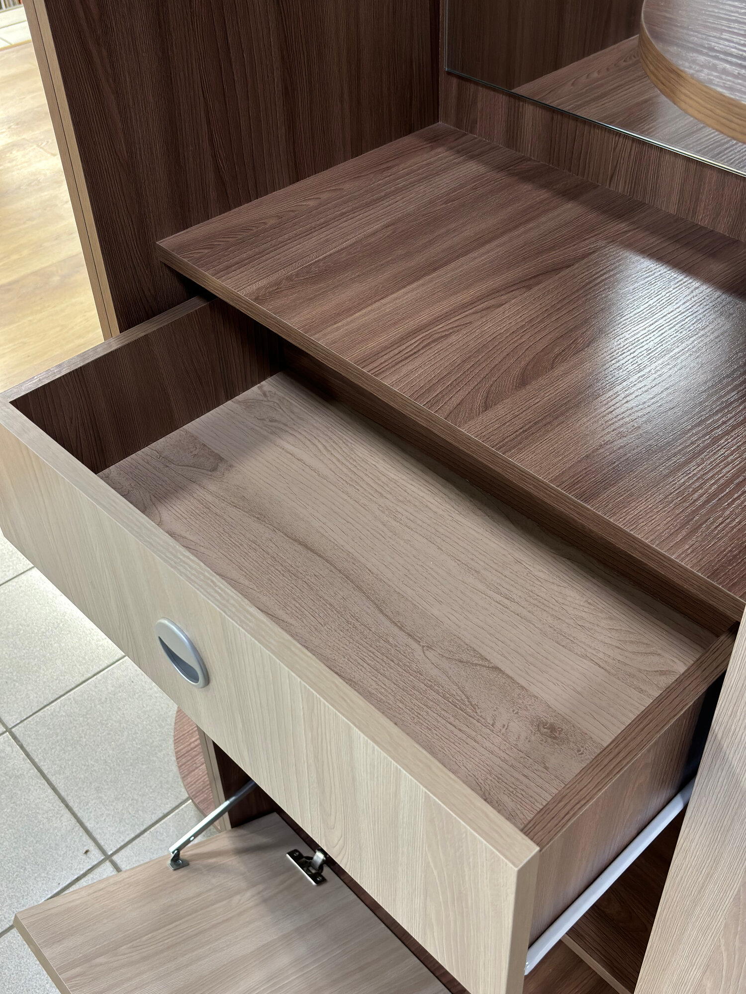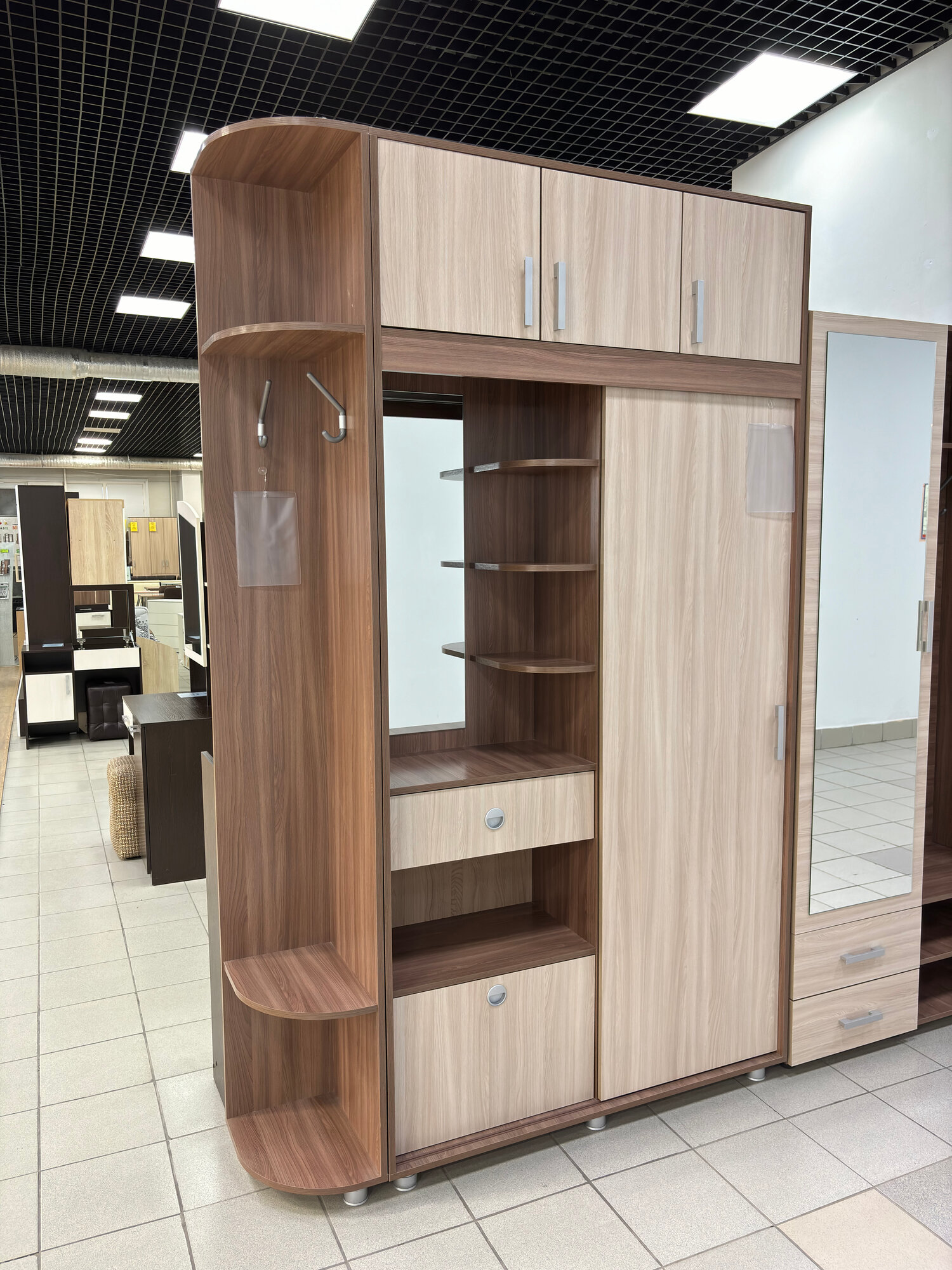 Прихожая комплект САША-6 (правая) от Фант-Мебель, с зеркалом, с обувницей, шкафом и ящиками, 156x203,6x43 см. Ясень темный/Ясень светлый