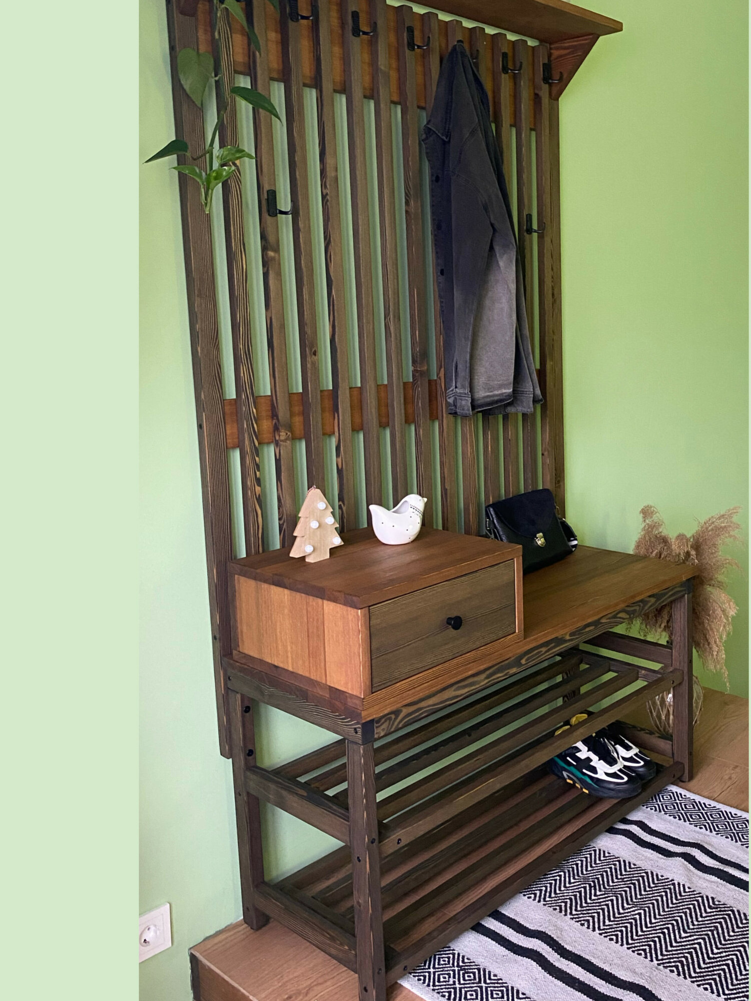 Комплект в прихожую, деревянная вешалка с обувницей, из массива Лиственницы 185х74х30, цвет можжевельник, минимализм