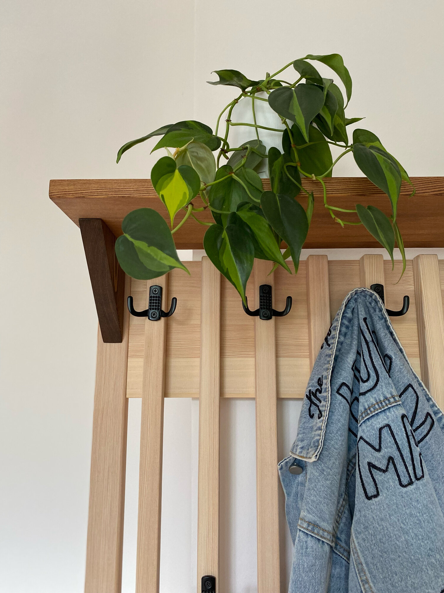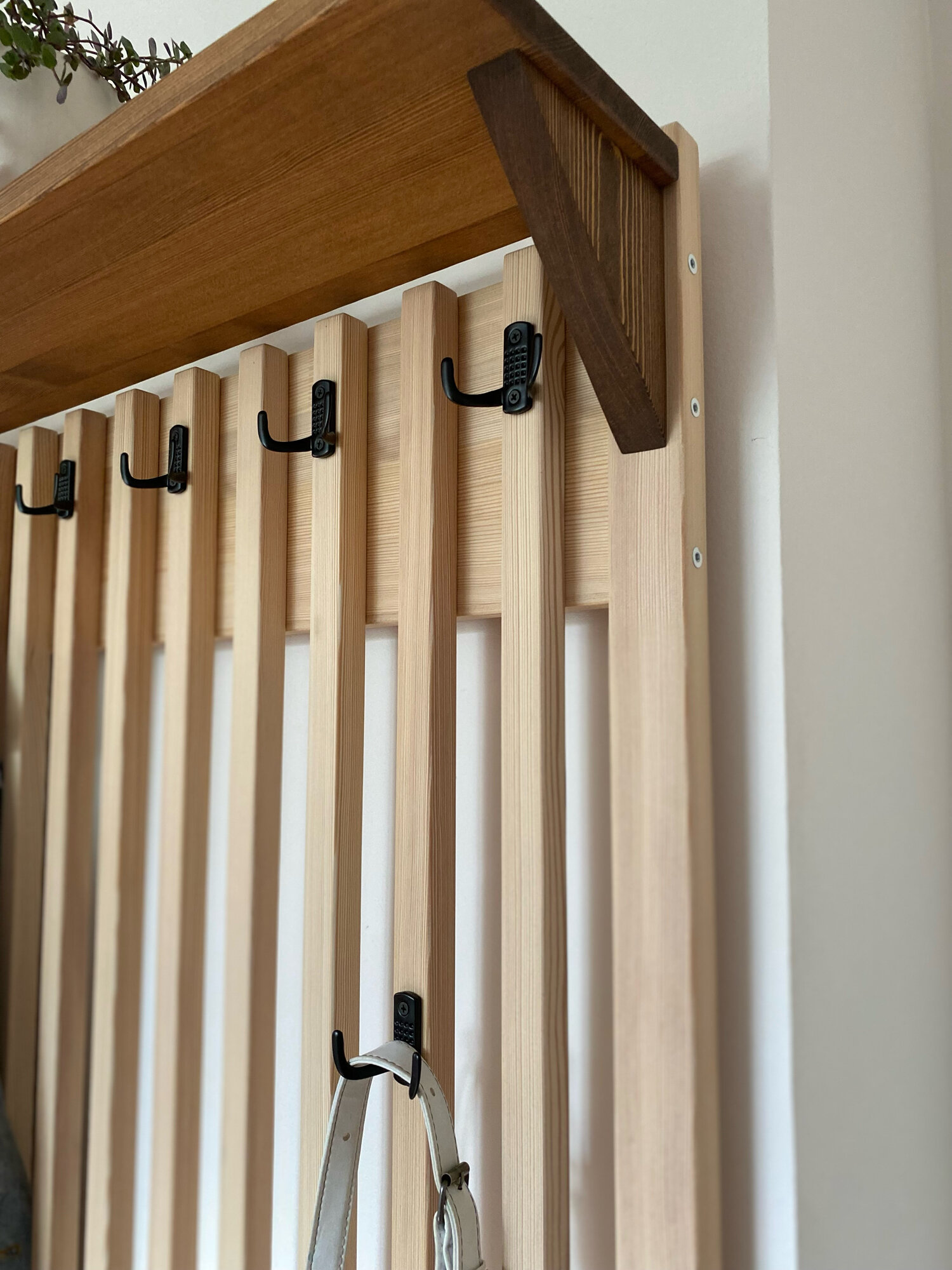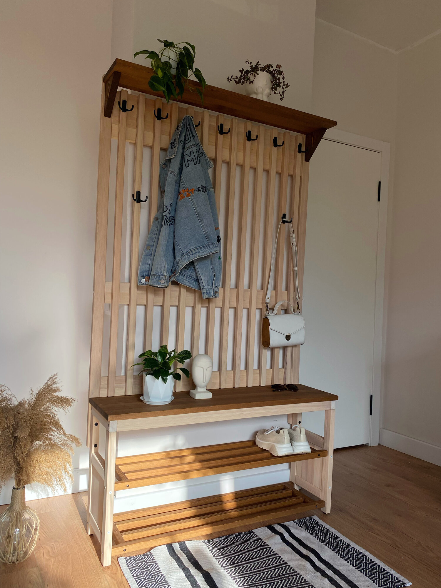 Комплект в прихожую, деревянная вешалка с обувницей, прихожая из массива Лиственницы 185х74х30, цвет орех, в скандинавском стиле, минимализм