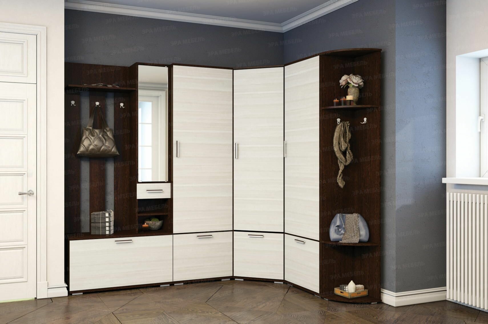 Прихожая комплект САША-6 (правая) от Фант-Мебель, с зеркалом, с обувницей, шкафом и ящиками, 156x203,6x43 см. Ясень темный/Ясень светлый