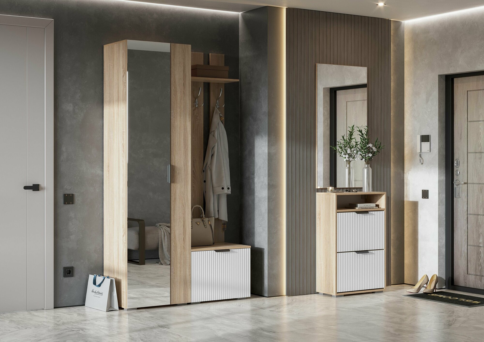 Прихожая комплект САША-6 (правая) от Фант-Мебель, с зеркалом, с обувницей, шкафом и ящиками, 156x203,6x43 см. Ясень темный/Ясень светлый