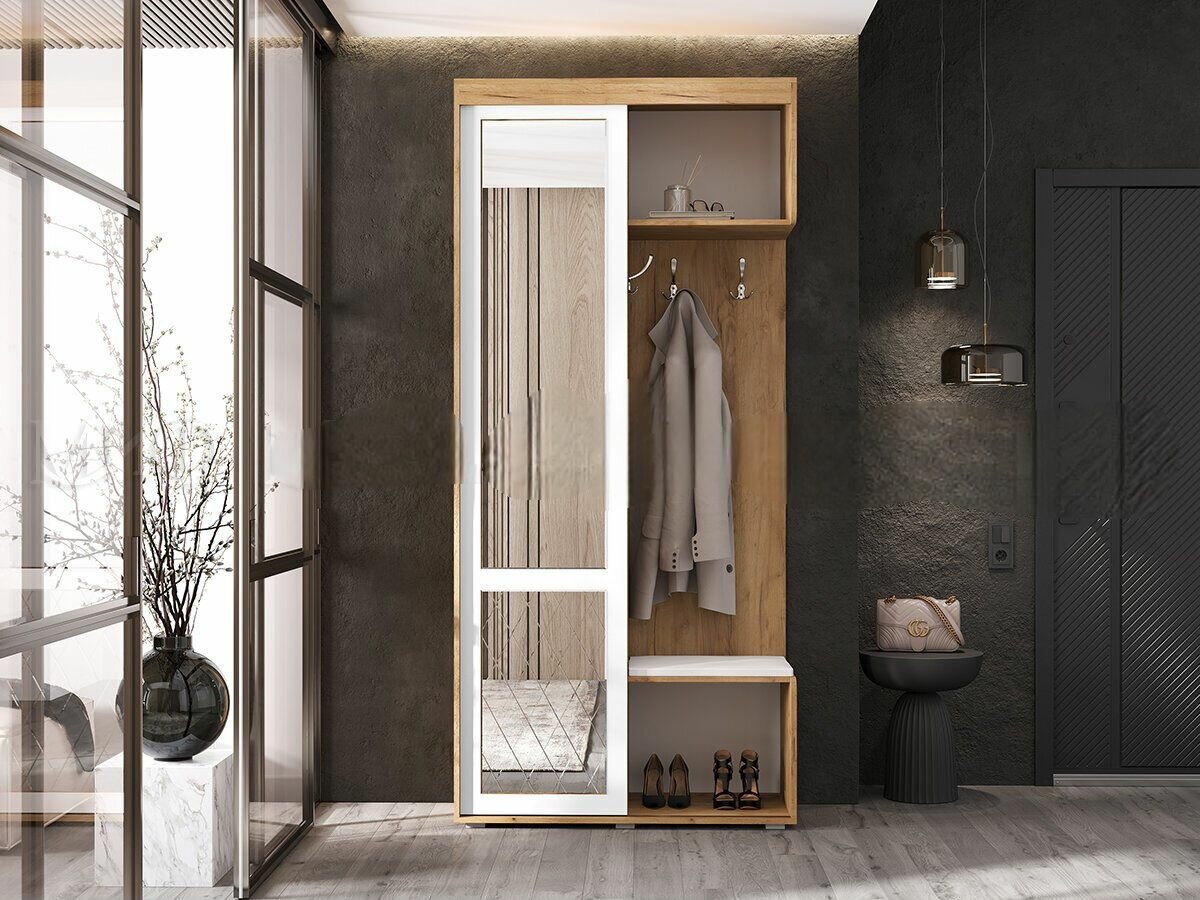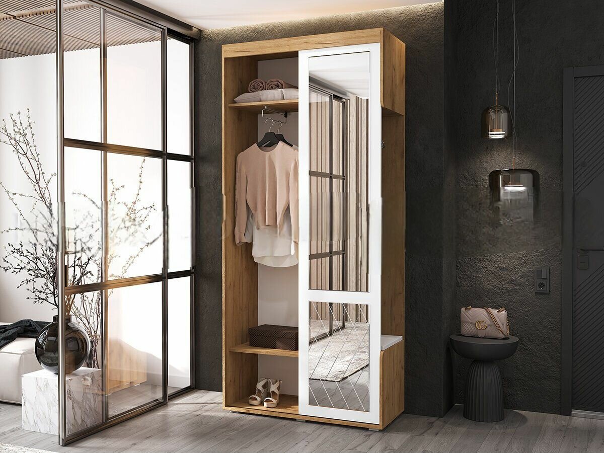 Прихожая комплект САША-6 (правая) от Фант-Мебель, с зеркалом, с обувницей, шкафом и ящиками, 156x203,6x43 см. Ясень темный/Ясень светлый