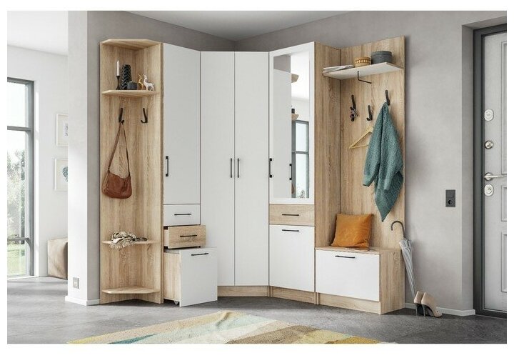Прихожая комплект САША-6 (правая) от Фант-Мебель, с зеркалом, с обувницей, шкафом и ящиками, 156x203,6x43 см. Ясень темный/Ясень светлый