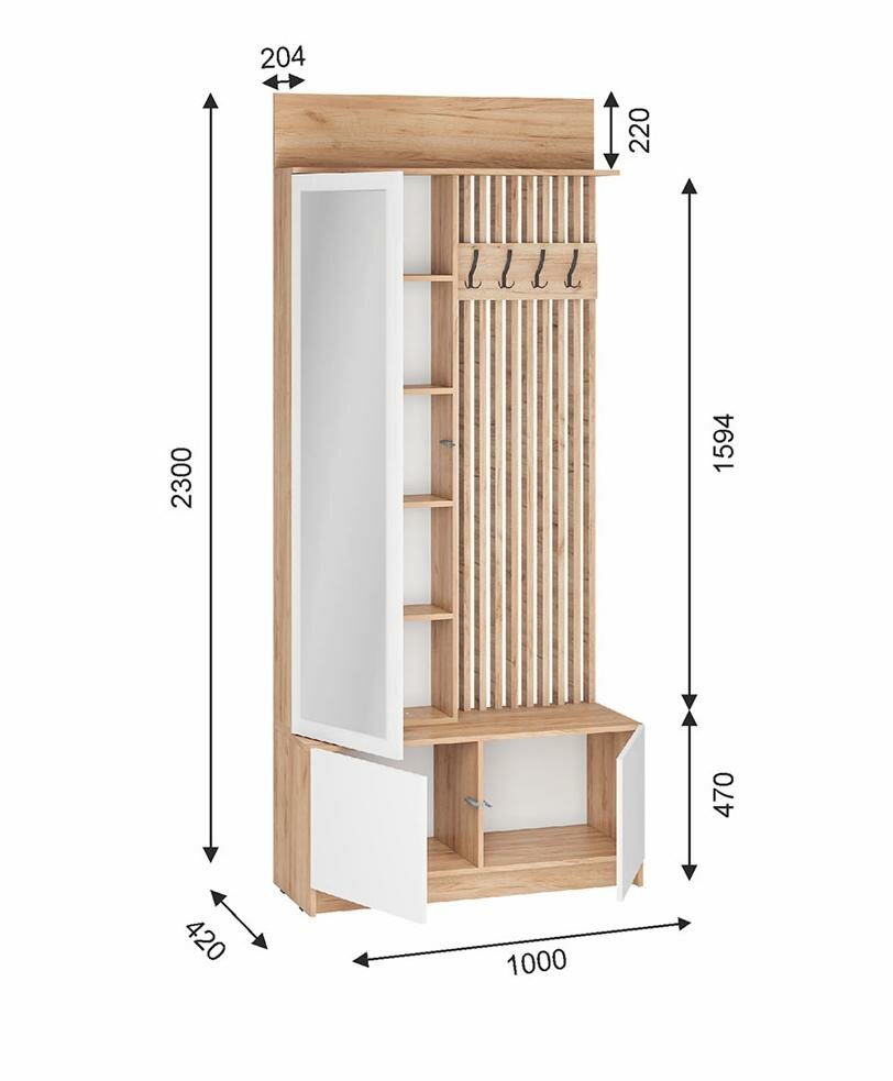 Прихожая комплект САША-6 (правая) от Фант-Мебель, с зеркалом, с обувницей, шкафом и ящиками, 156x203,6x43 см. Ясень темный/Ясень светлый