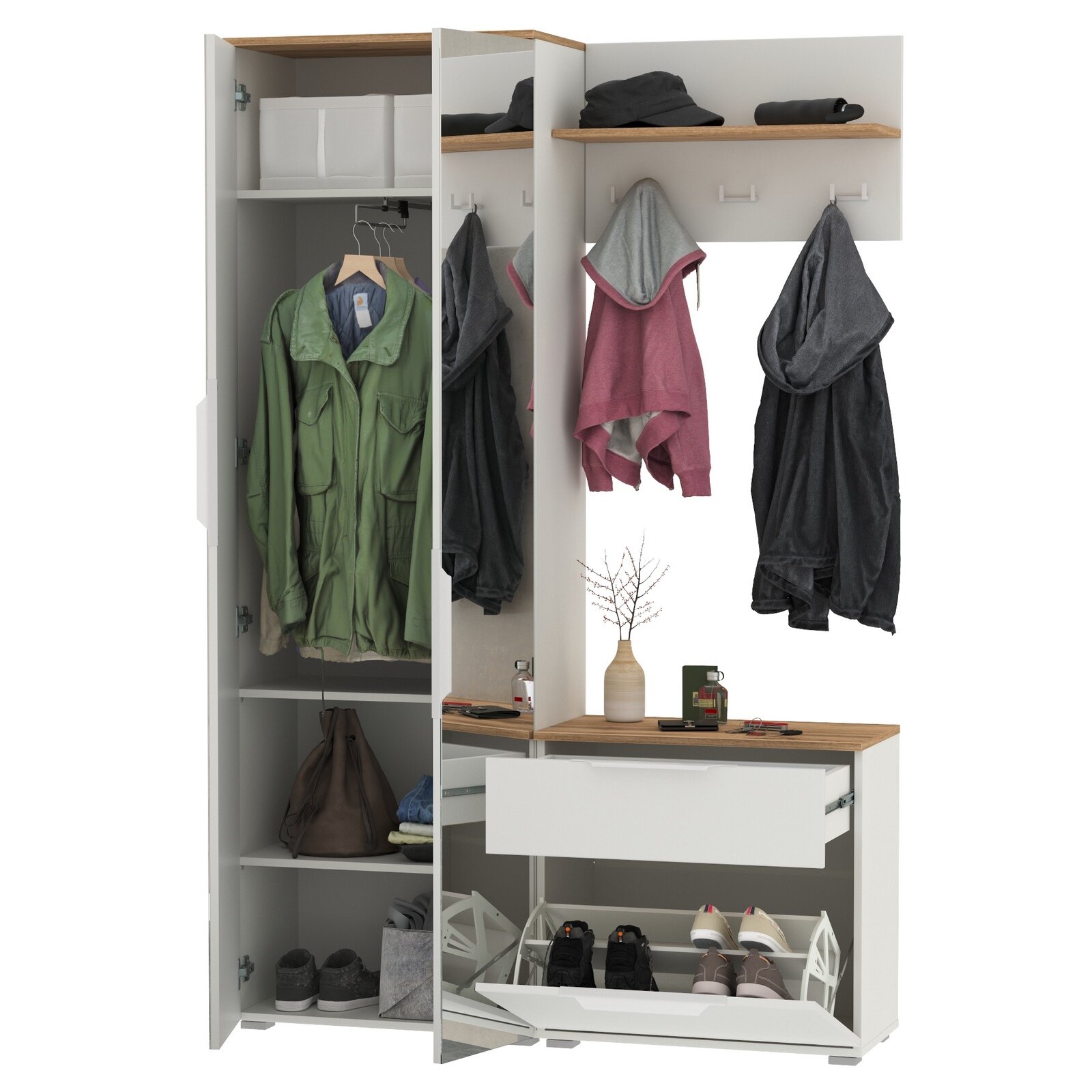 Прихожая комплект САША-6 (правая) от Фант-Мебель, с зеркалом, с обувницей, шкафом и ящиками, 156x203,6x43 см. Ясень темный/Ясень светлый