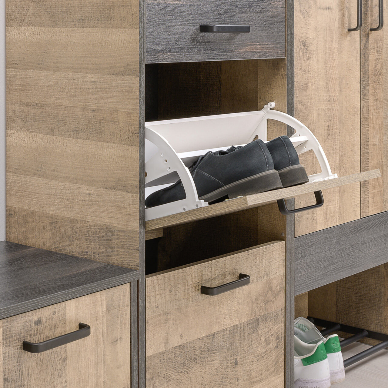 Купить Прихожая открытая с высокой обувницей с зеркалом Трувор, цвет дуб гранж песочный/интра, ШхГхВ 130х37х194,2 см, универсальная сборка