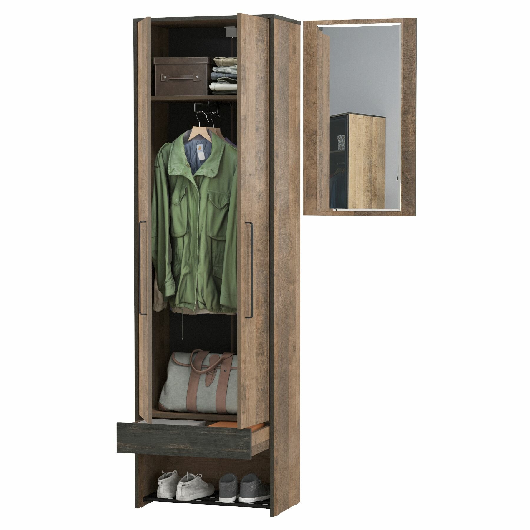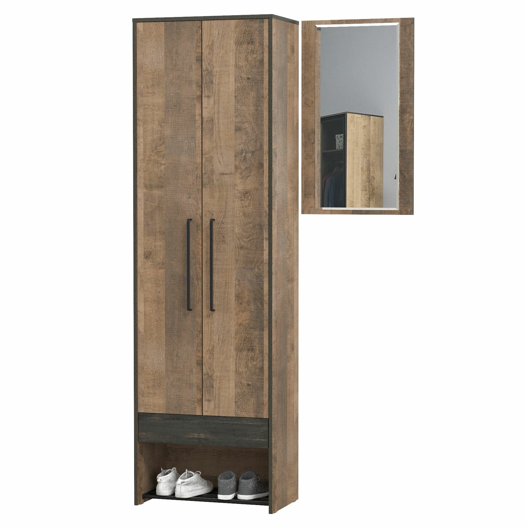Прихожая комплект САША-6 (правая) от Фант-Мебель, с зеркалом, с обувницей, шкафом и ящиками, 156x203,6x43 см. Ясень темный/Ясень светлый