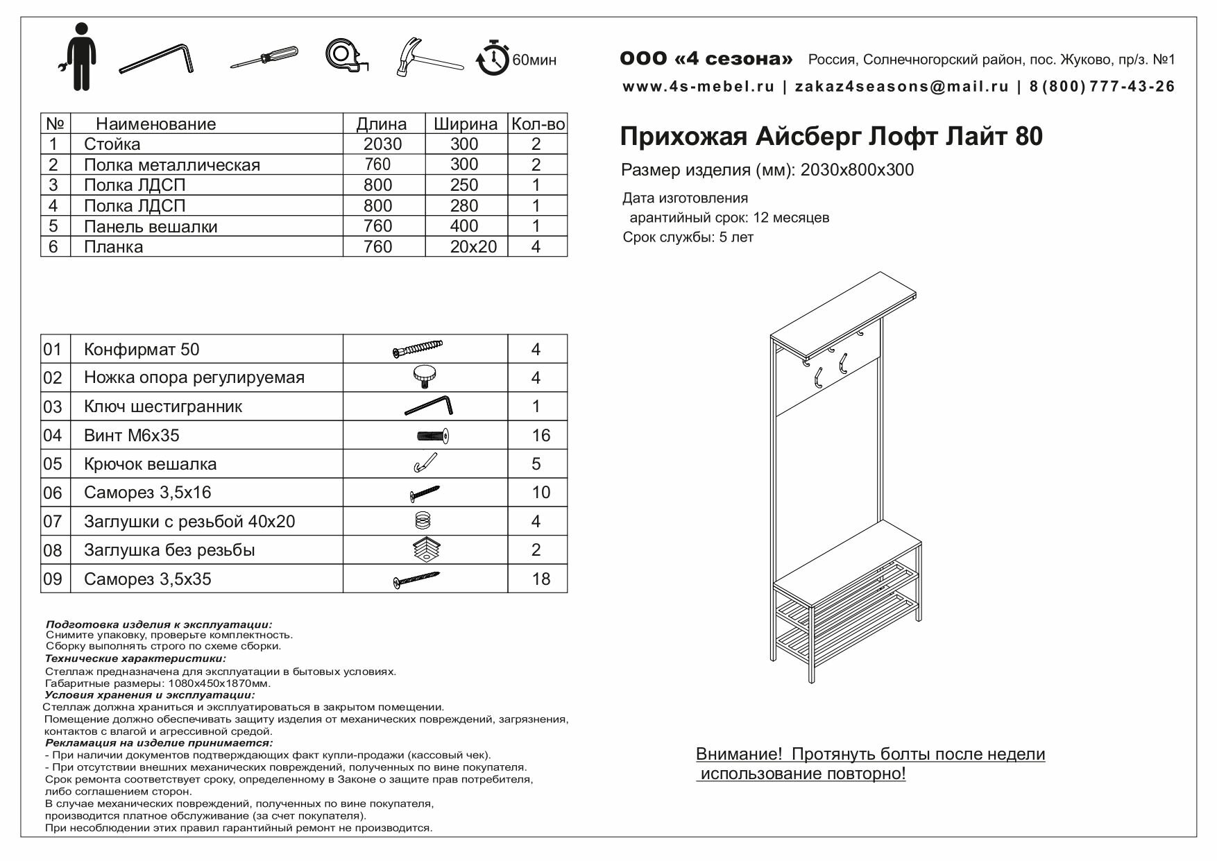 Прихожая Айсберг Лофт Лайт 80 Белый/Северное дерево темное интересное: