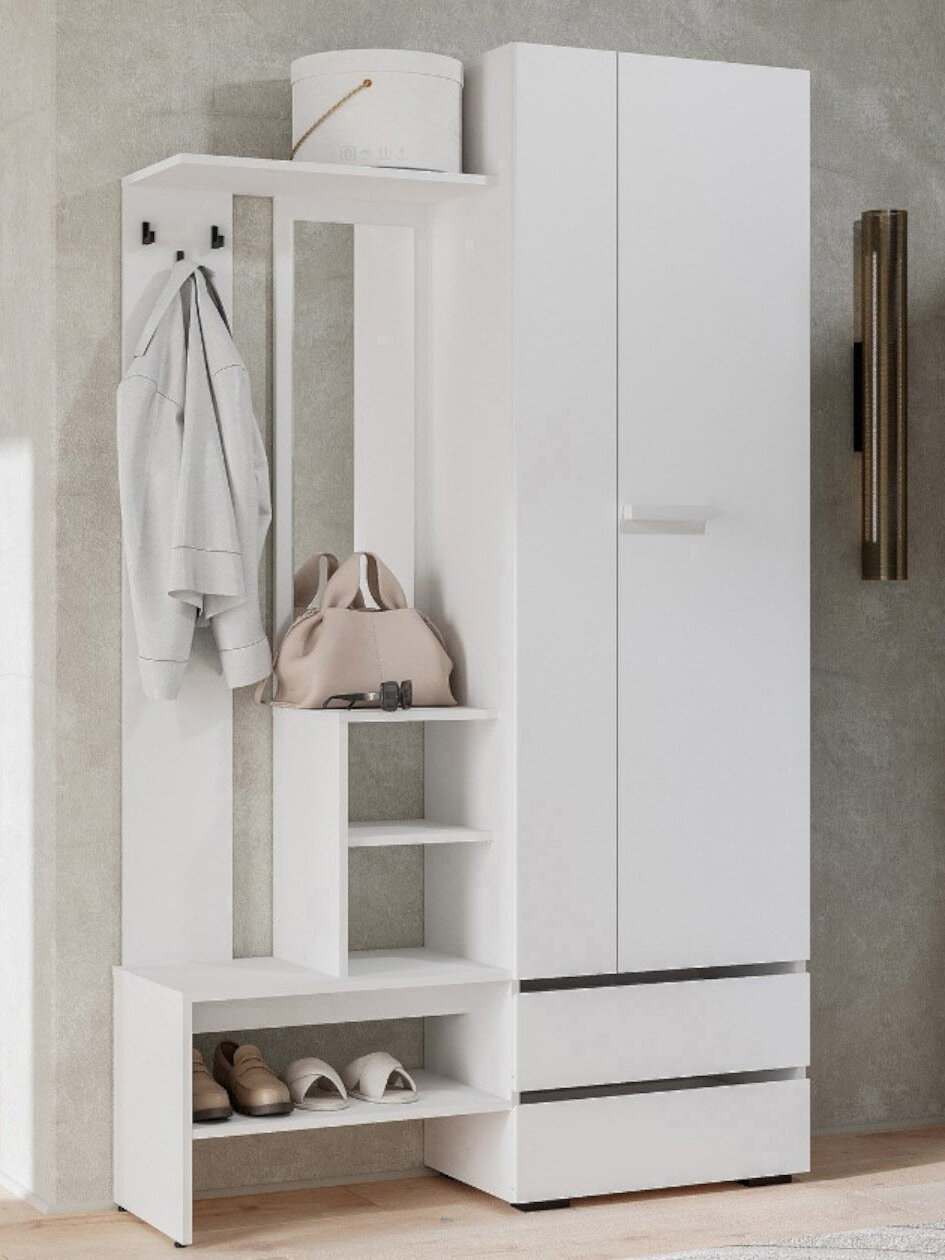 Прихожая комплект Эссо с комодом, полками, со шкафом, с вешалкой, с зеркалом, 140.4х37.2х202 см, Белый