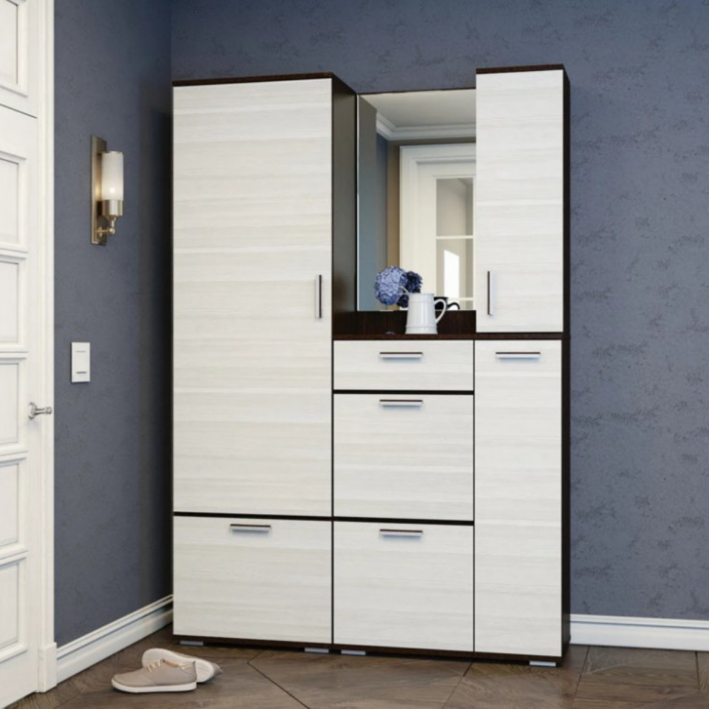 Прихожая комплект САША-6 (правая) от Фант-Мебель, с зеркалом, с обувницей, шкафом и ящиками, 156x203,6x43 см. Ясень темный/Ясень светлый