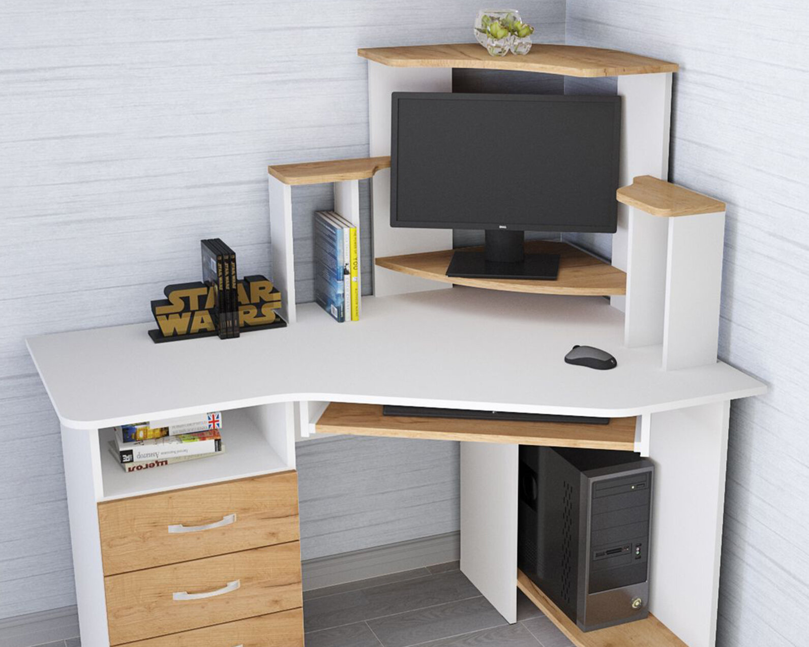 Компьютерный стол размером 1335x1300x900 мм, корпус из ЛДСП - Дуб Крафт золотой, фасад из ЛДСП - Белый с тиснением.