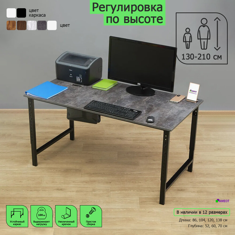 Купить Компьютерный стол регулируемый по высоте Мадий 12ЦТ ш138/г70/в61-91 цемент темный/черный на металлокаркасе