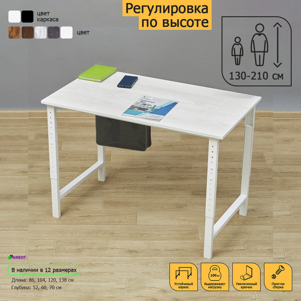 Компьютерный стол регулируемый по высоте Мадий 12СW ш86/г52/в61-91 сосна битон белый на металлокаркасе