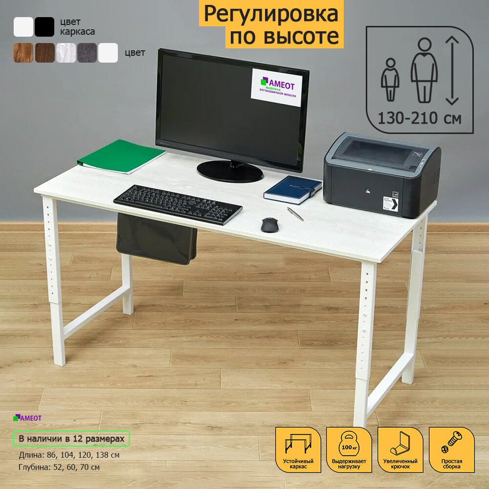Компьютерный стол регулируемый по высоте Мадий 12WW ш86/г52/в61-91 белый на металлокаркасе