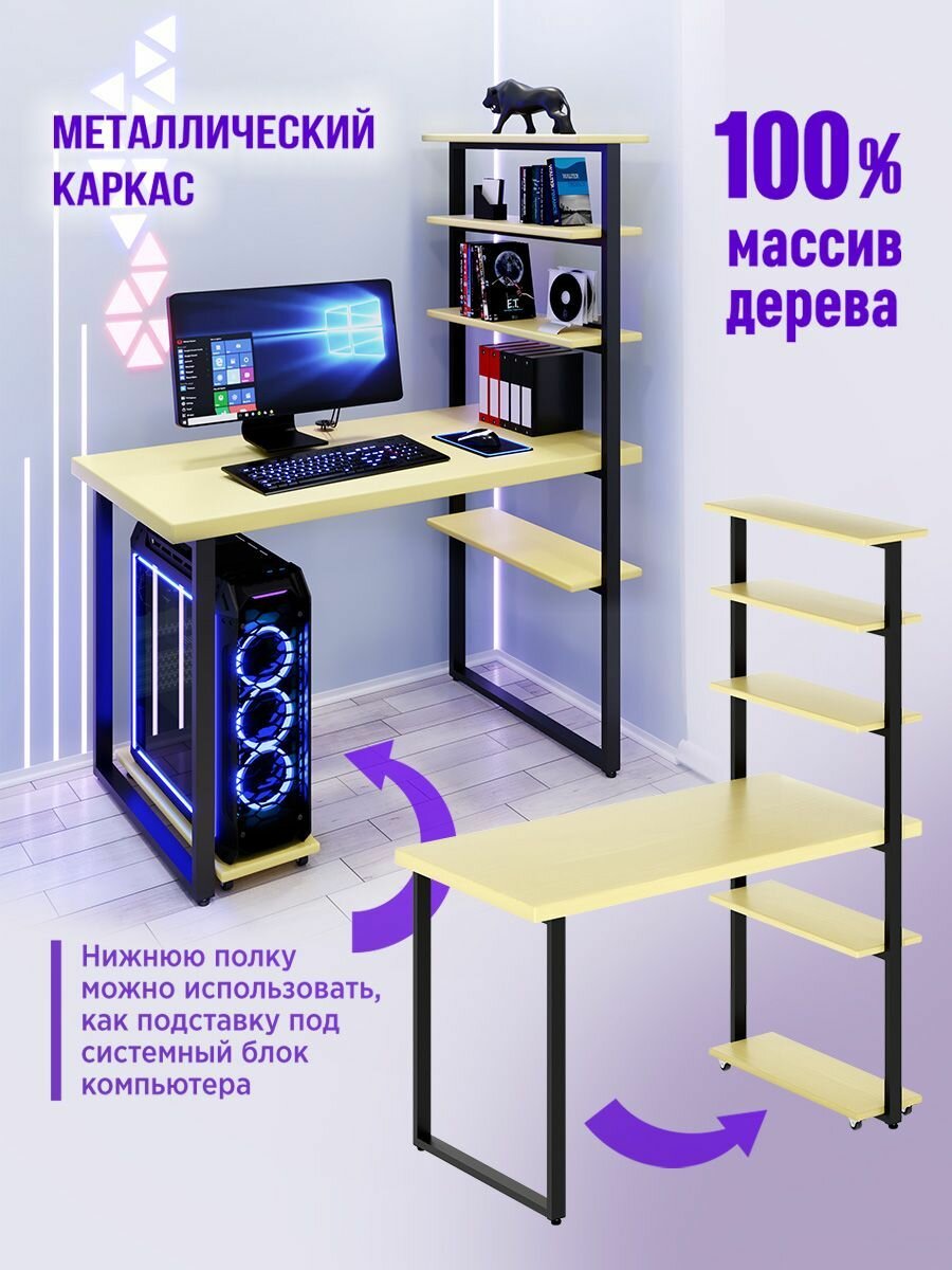 Стол компьютерный Loft с пятью полками, столешница цвета ванили из массива сосны 40 мм и черные металлические ножки, 120х80х148 см