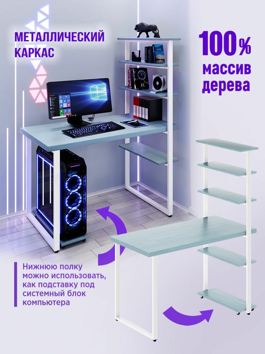Стол компьютерный Loft с пятью полками, столешница голубого цвета из массива сосны 40 мм и белые металлические ножки, 120х60х148 см