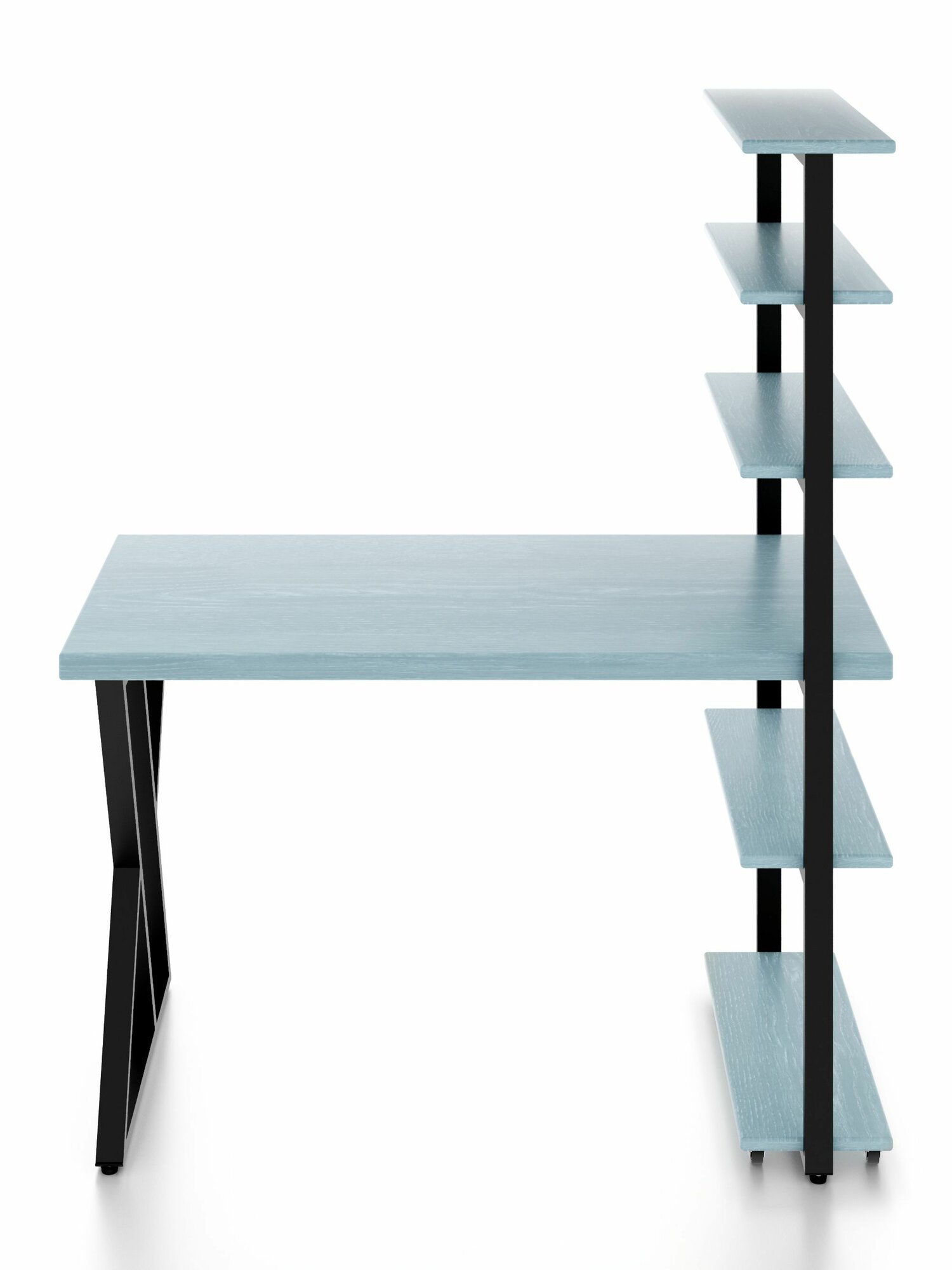 Стол компьютерный Loft с пятью полками, столешница голубого цвета из массива сосны 40 мм и черные металлические Z-образные ножки, 100х60х148 см