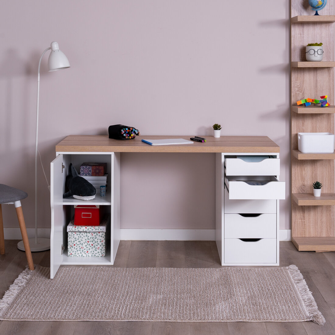 Купить Стол письменный ГУД ЛАКК ИНГАР с дверцей и 5 ящиками, 140x75x55, белый, столешница: дуб беленый