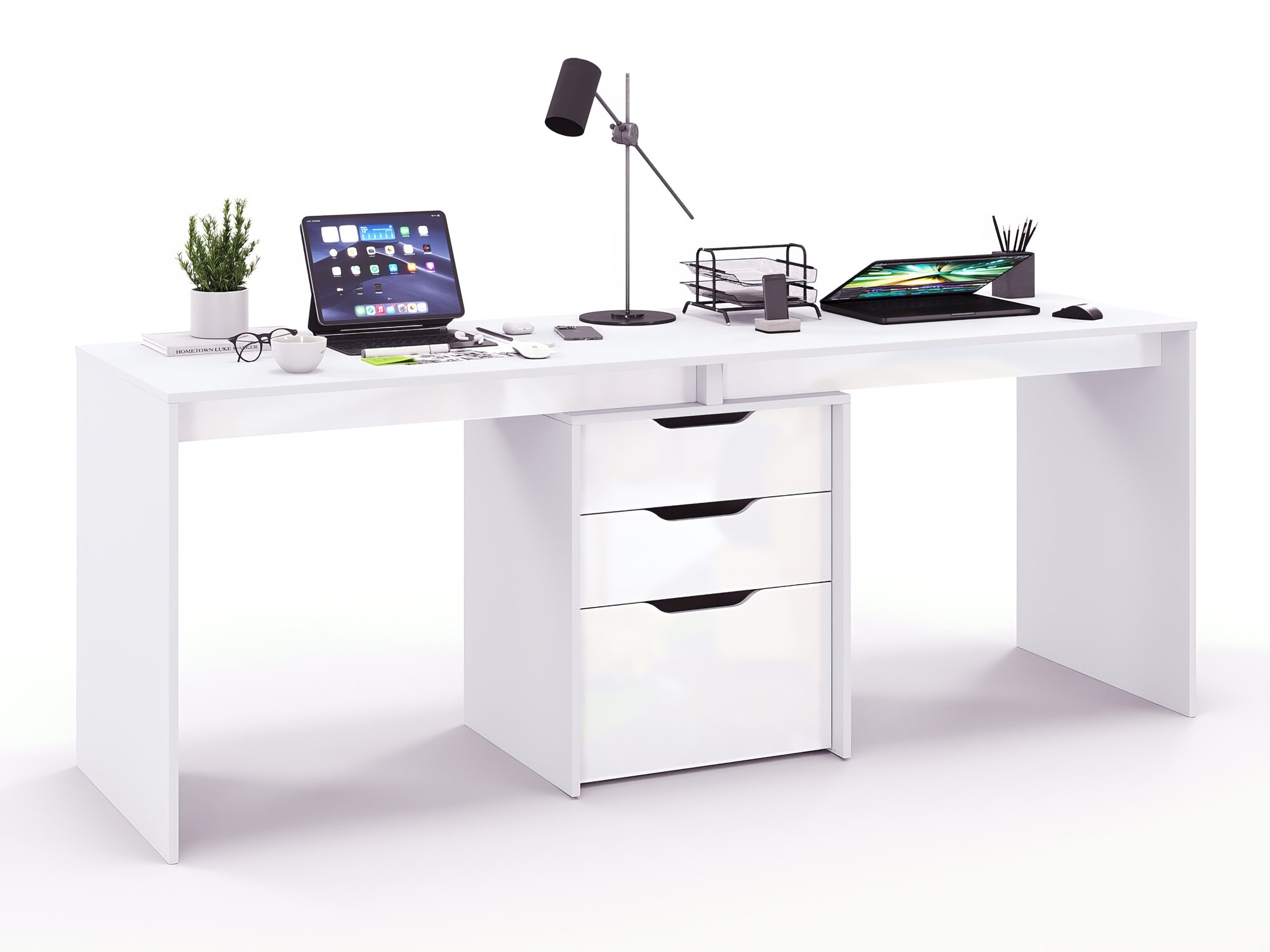 Письменный стол двойной, с тумбой, с ящиками Double Grand Лаворо 220х60х75 см (Белый/Белый глянец)