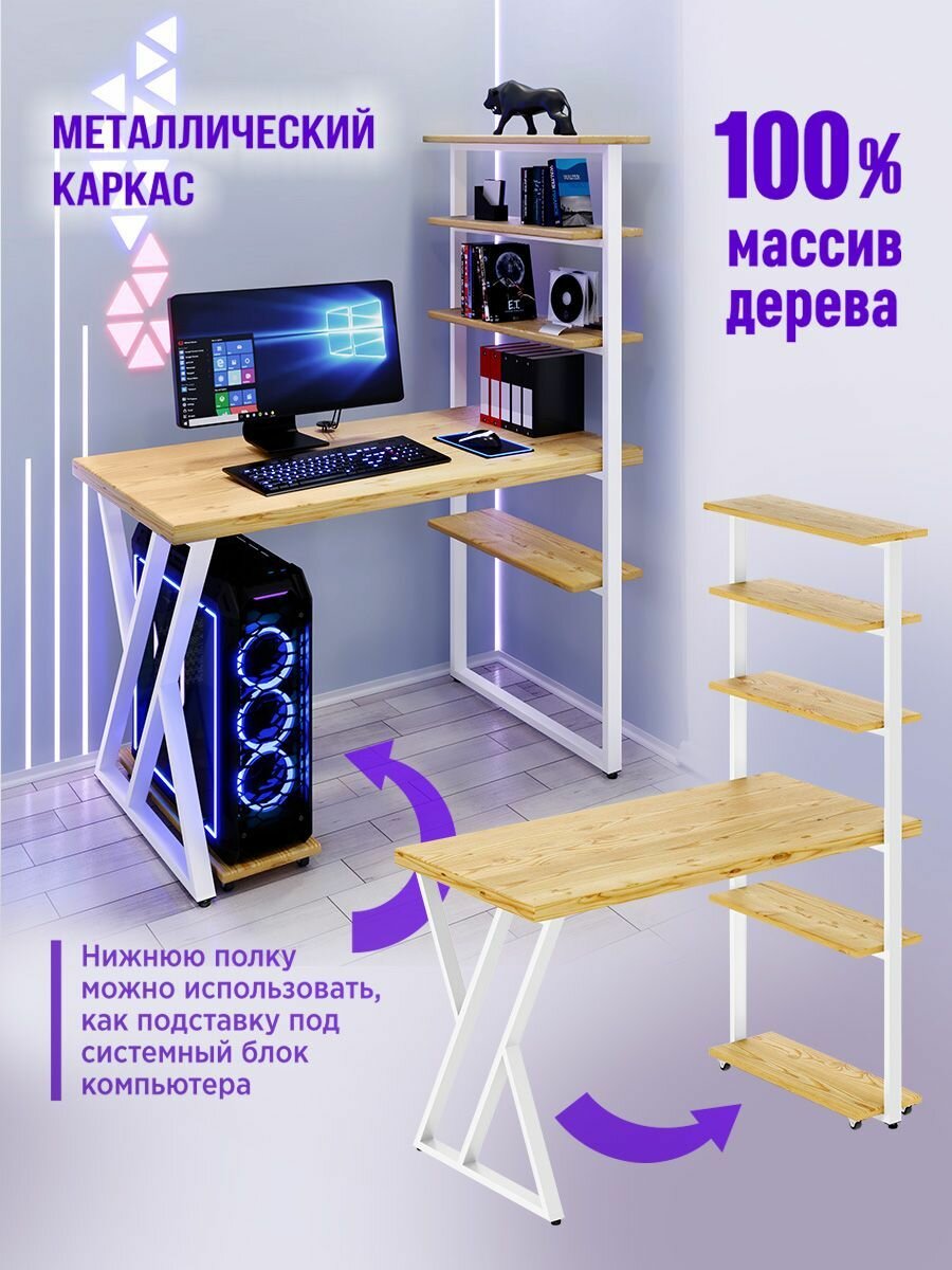 Стол компьютерный Loft с пятью полками, лакированная столешница из массива сосны 40 мм и белые металлические Z-образные ножки, 110х60х148 см