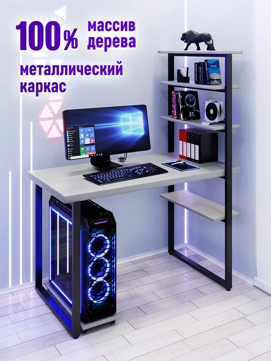 Стол компьютерный Loft с пятью полками, столешница белого цвета из массива сосны 40 мм и черные металлические ножки, 100х60х148 см