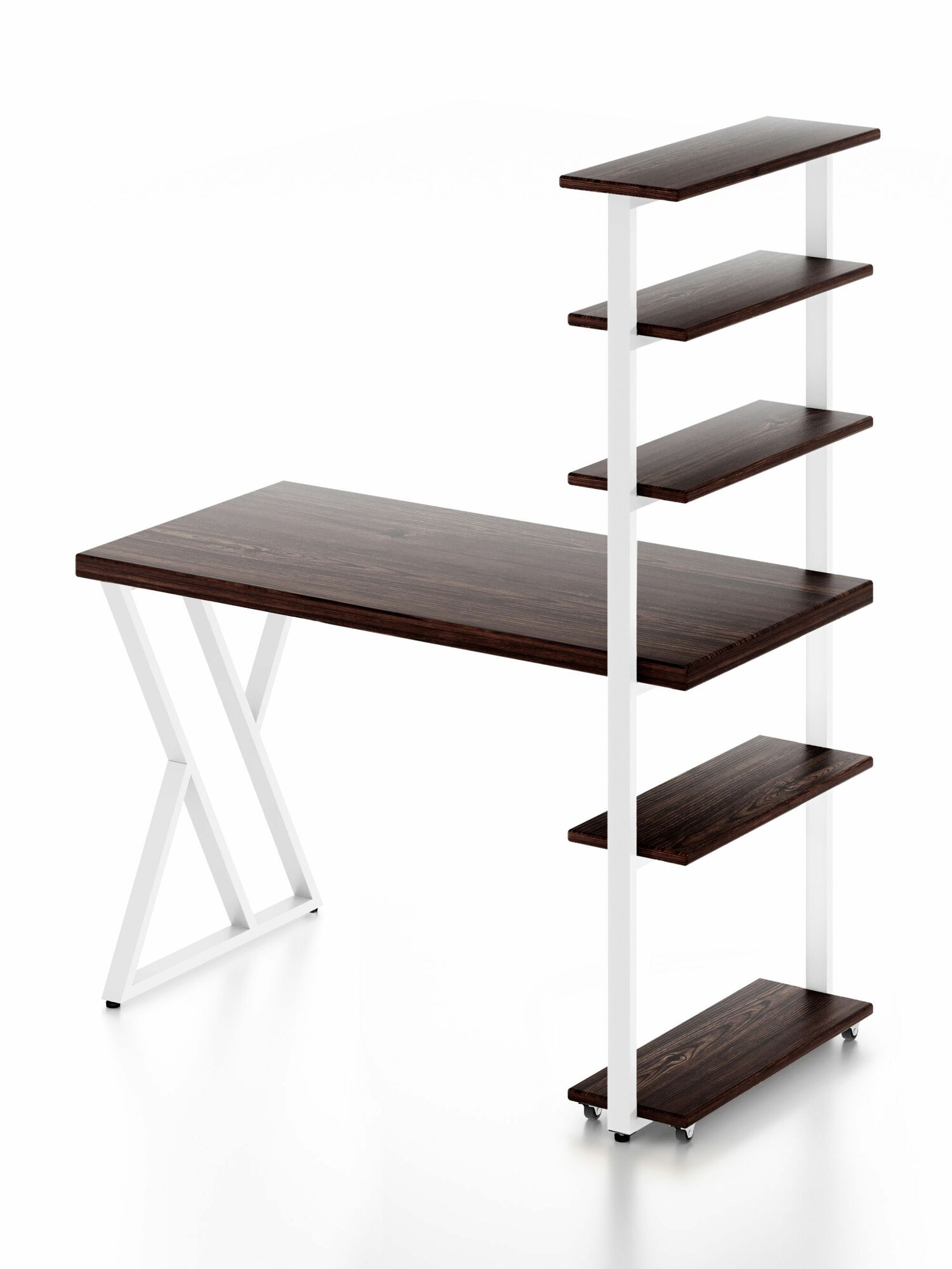 Стол компьютерный Loft с пятью полками, столешница цвета венге из массива сосны 40 мм и белые металлические Z-образные ножки, 100х60х148 см