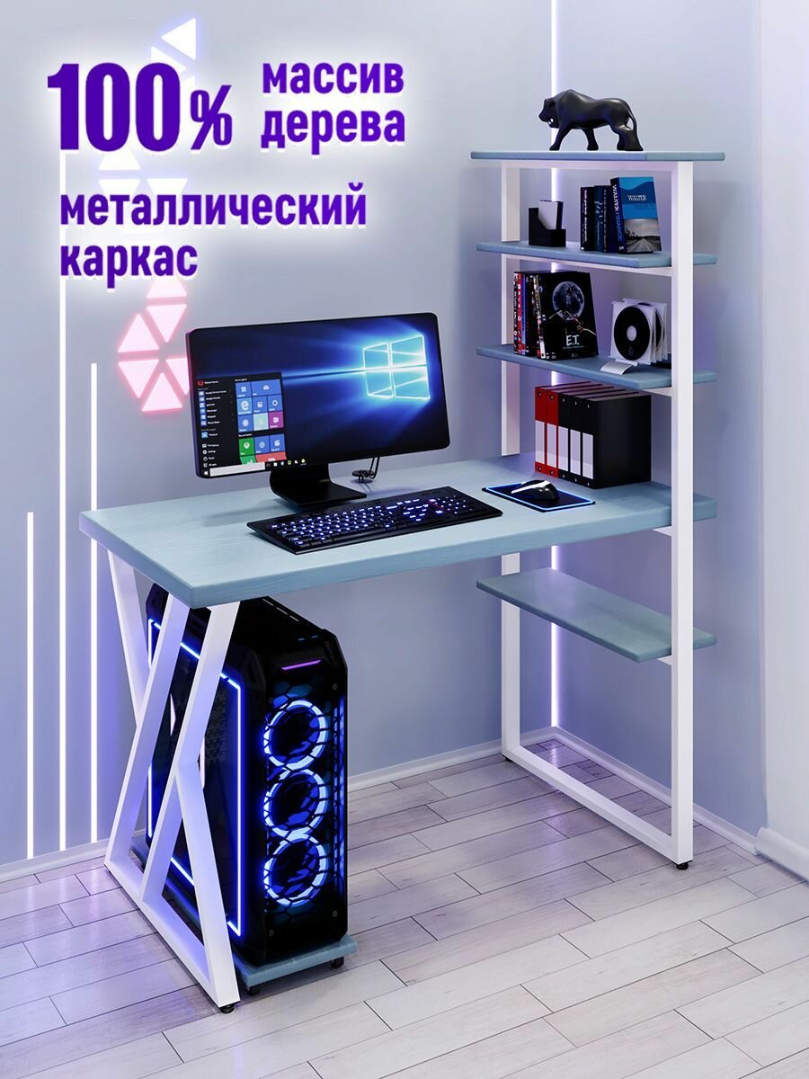 Купить Стол компьютерный Loft с пятью полками, столешница голубого цвета из массива сосны 40 мм и белые металлические Z-образные ножки, 140х60х145 см