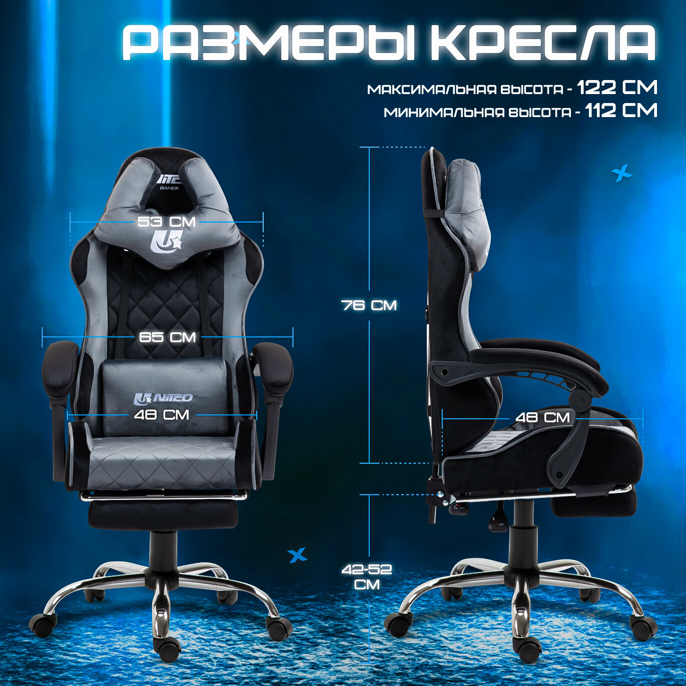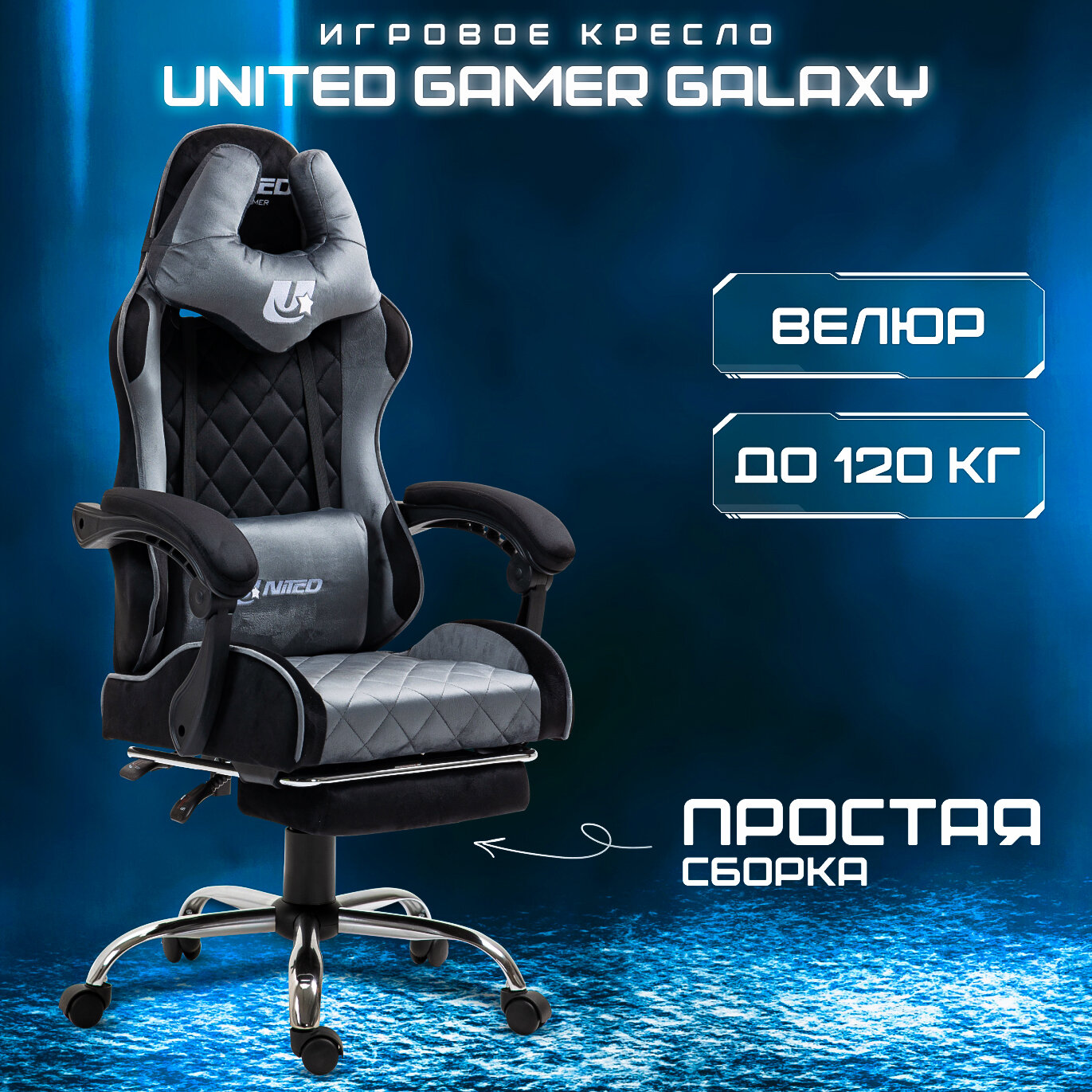 Кресло компьютерное UNITED GAMER GALAXY, подставка для ног, черный/серый велюр интересное: