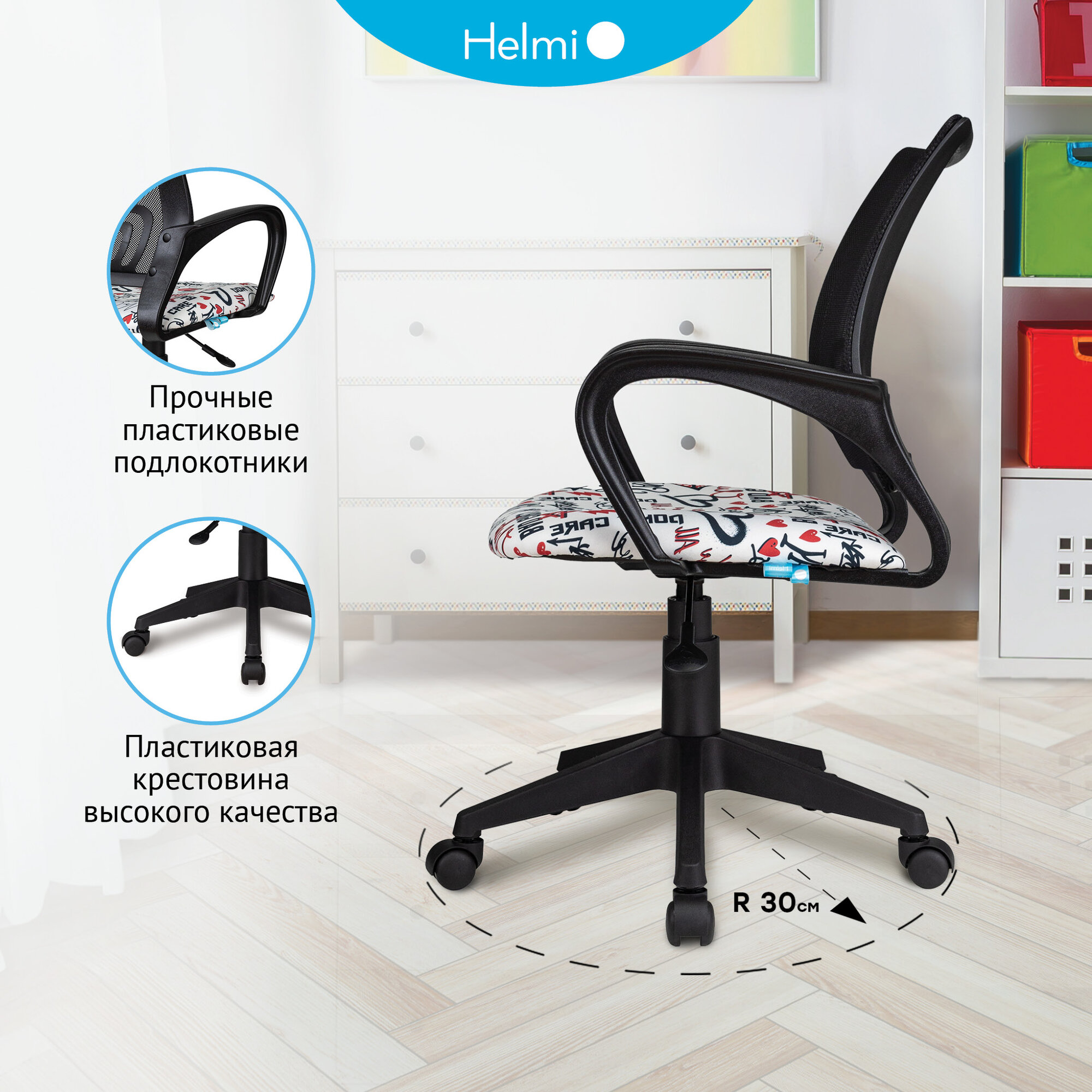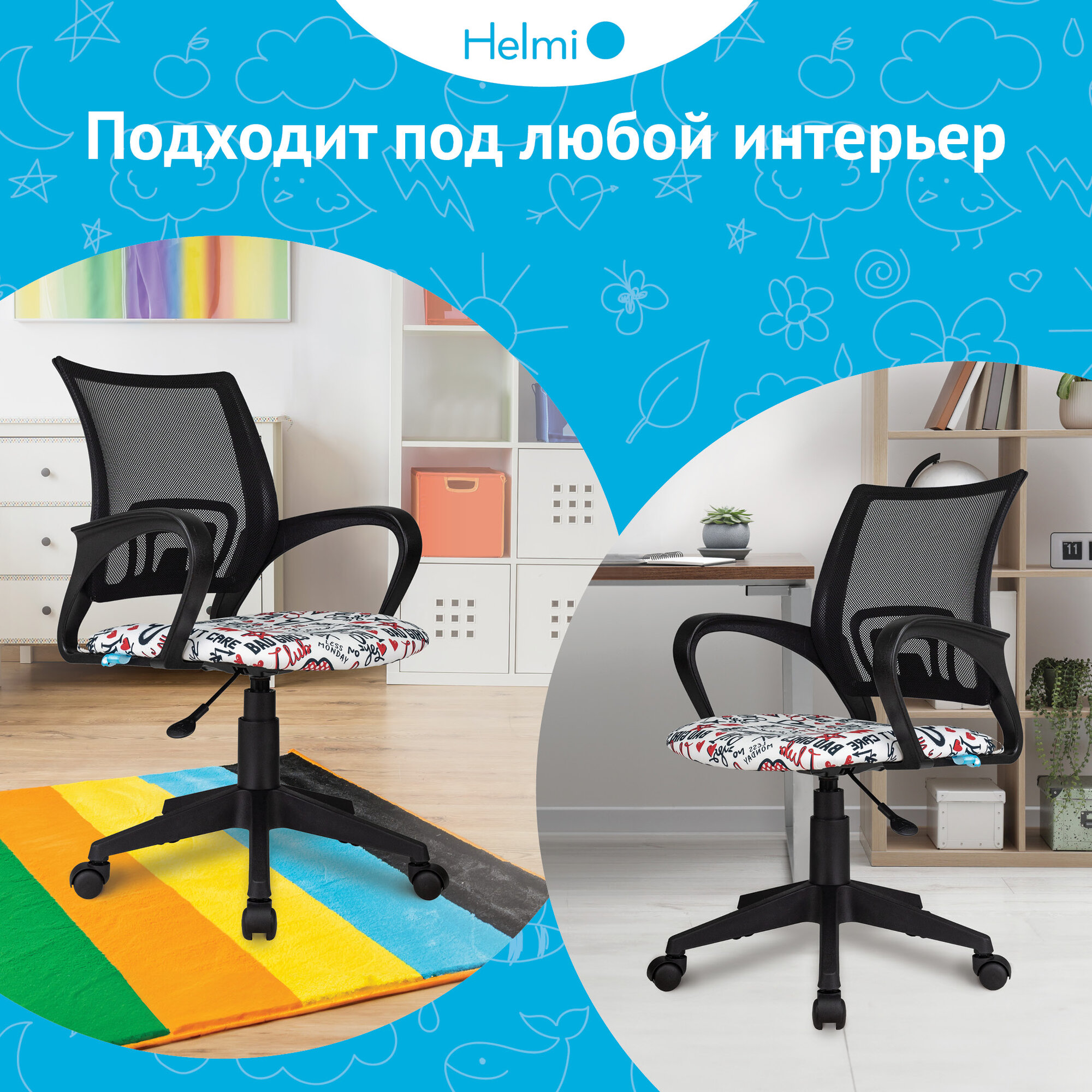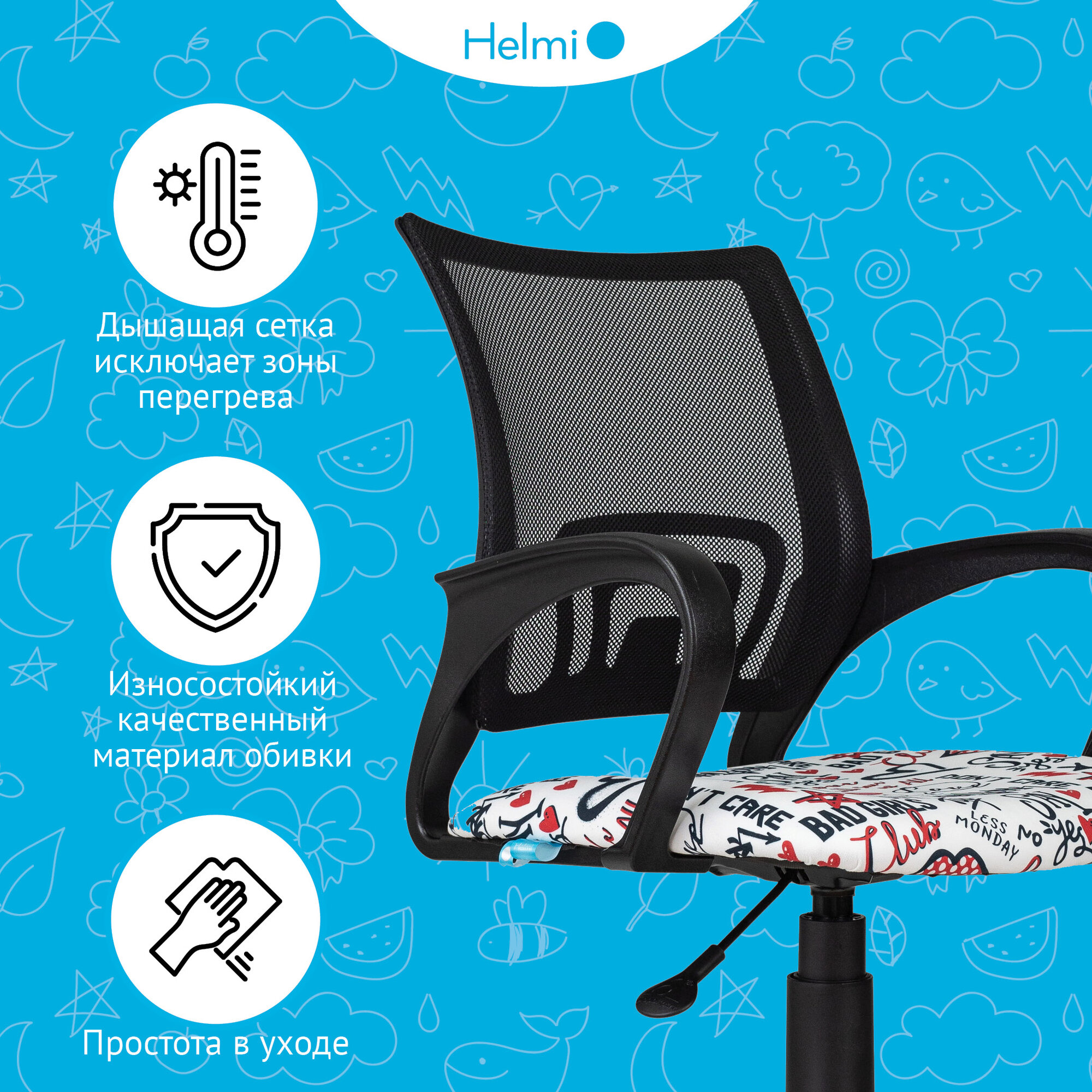 Кресло детское Helmi HL-K95 R (695) "Airy", спинка сетка черная/сиденье ткань с рисунком red lips, пиастра интересное: