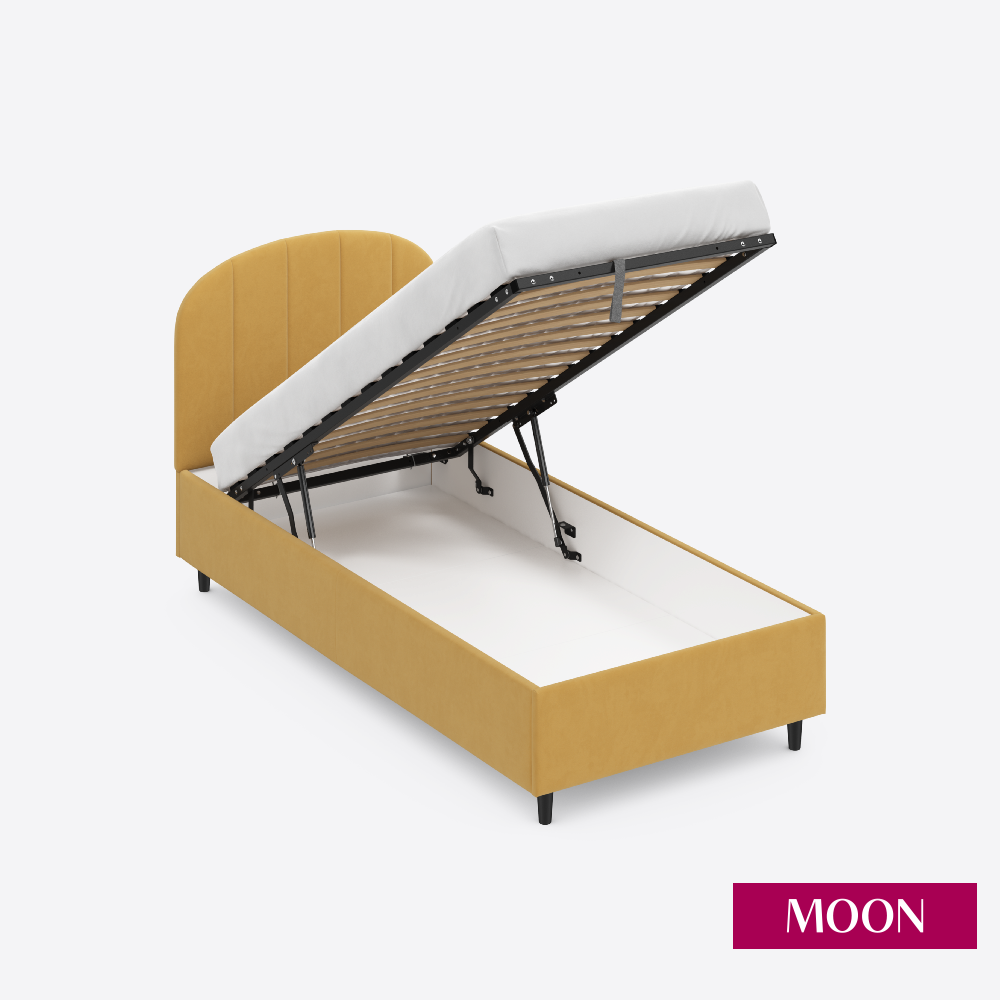 СохранитьКровать односпальная с подъемным механизмом на ножках, MOON FAMILY 1262, размер 90х200 см, велюр желтый. Ортопедическое основание в комплекте интересное: