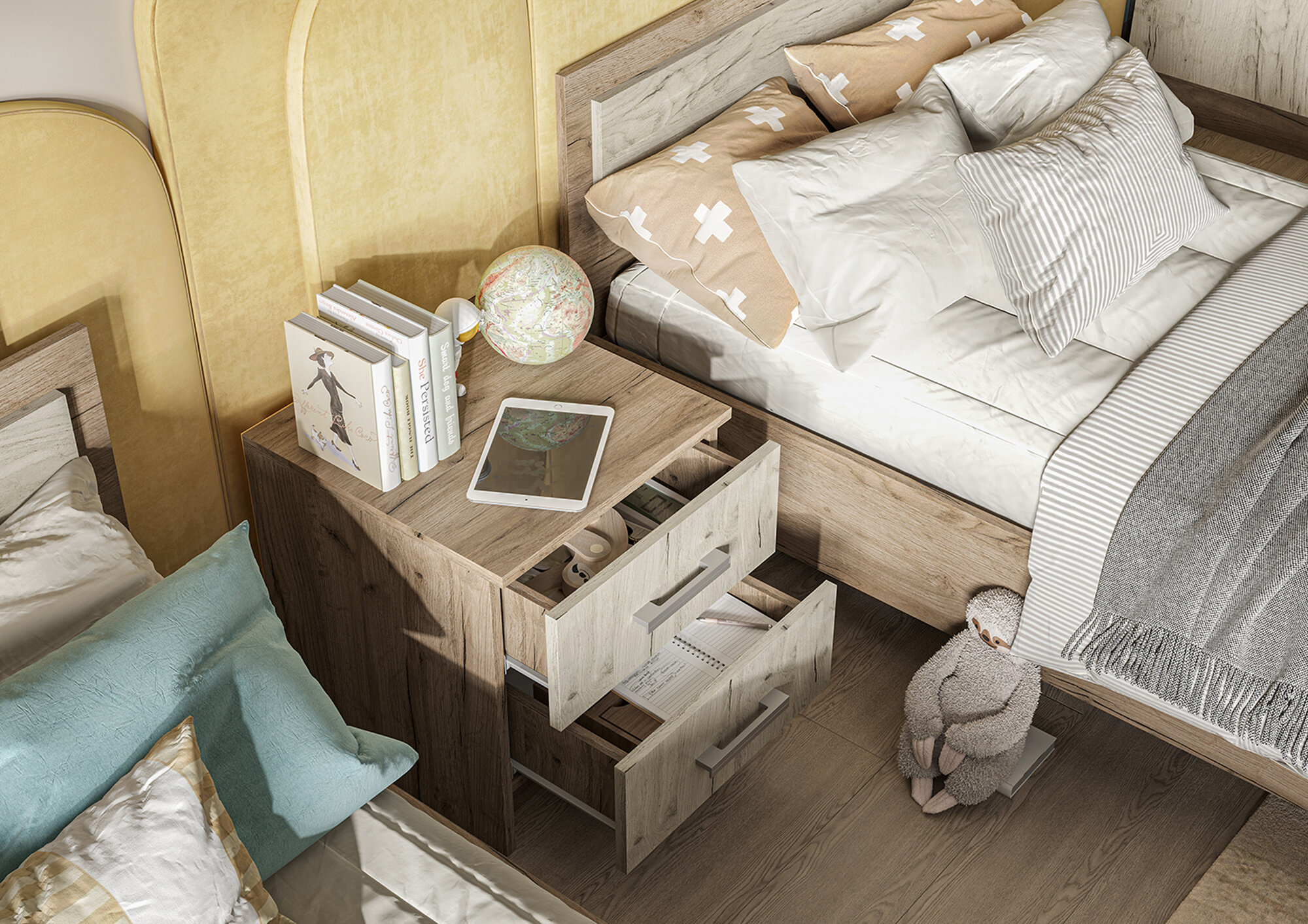 Кровать с ящиками 1800 с двумя тумбочками Камелия, цвет дуб сонома, ШхГхВ 296х217х78,2 см, спальное место 1800х2000 мм, без матраса, основание есть