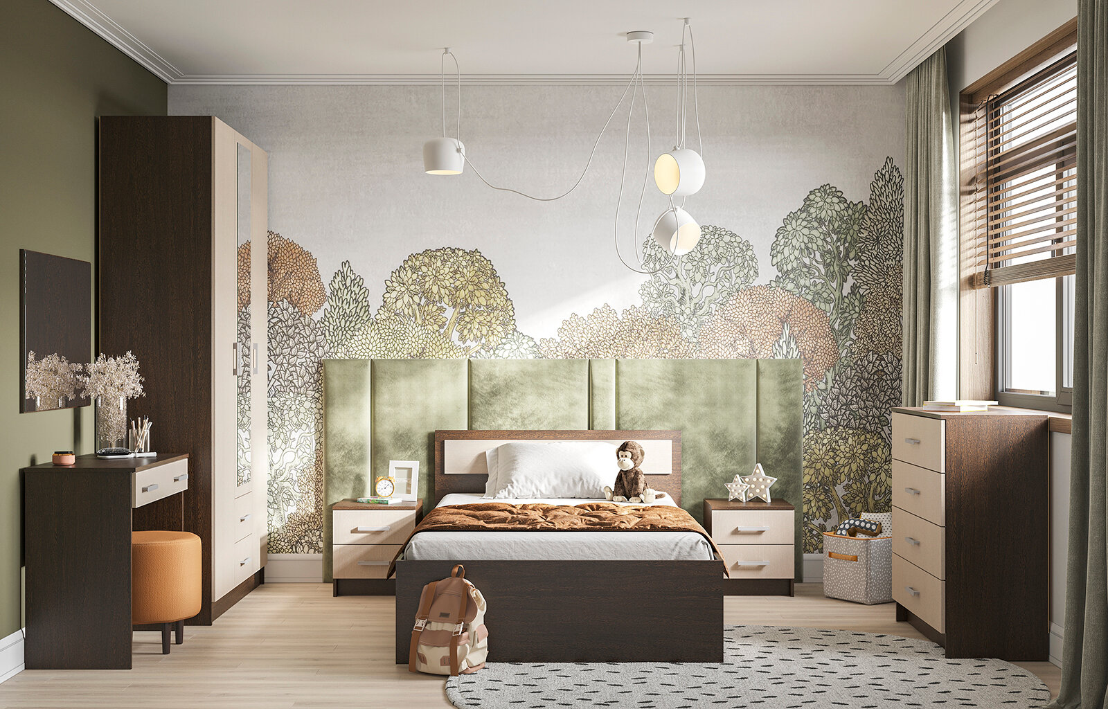 Кровать с закроватным модулем, габаритный размер: 2352x1024x2232 мм. Спальное место: 1600х2000 мм. Корпус: ЛДСП ясень Шимо темный, фасад: ЛДСП ясень Шимо светлый.