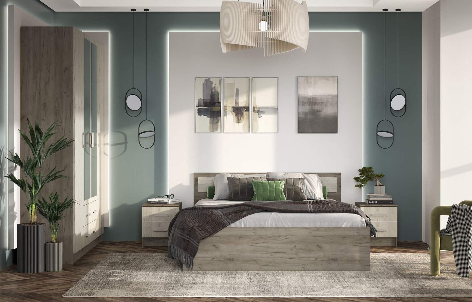 Кровать с ящиками 1800 с двумя тумбочками Камелия, цвет дуб сонома, ШхГхВ 296х217х78,2 см, спальное место 1800х2000 мм, без матраса, основание есть