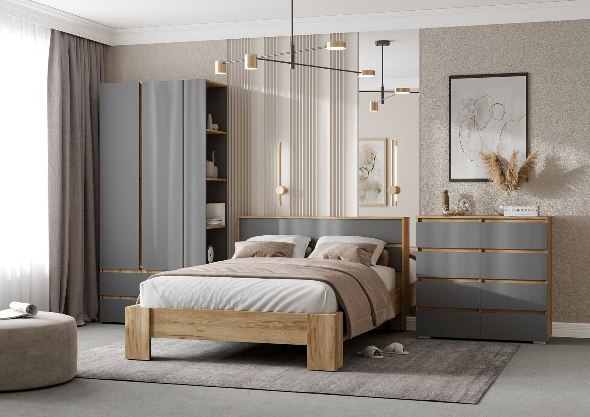 Кровать двуспальная Хелен КР 02 1,4, серый графит/дуб крафт золото