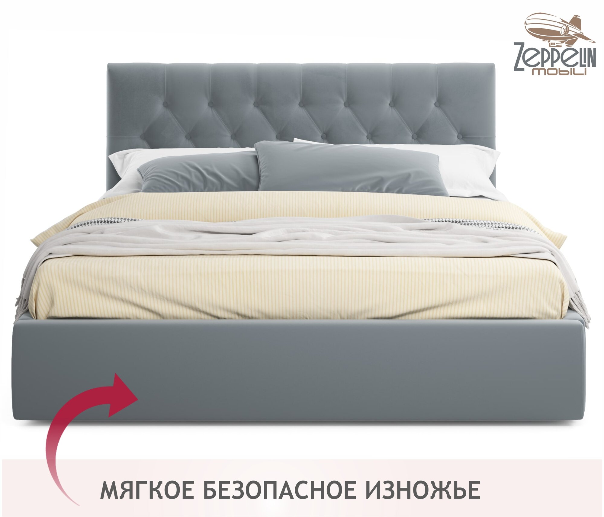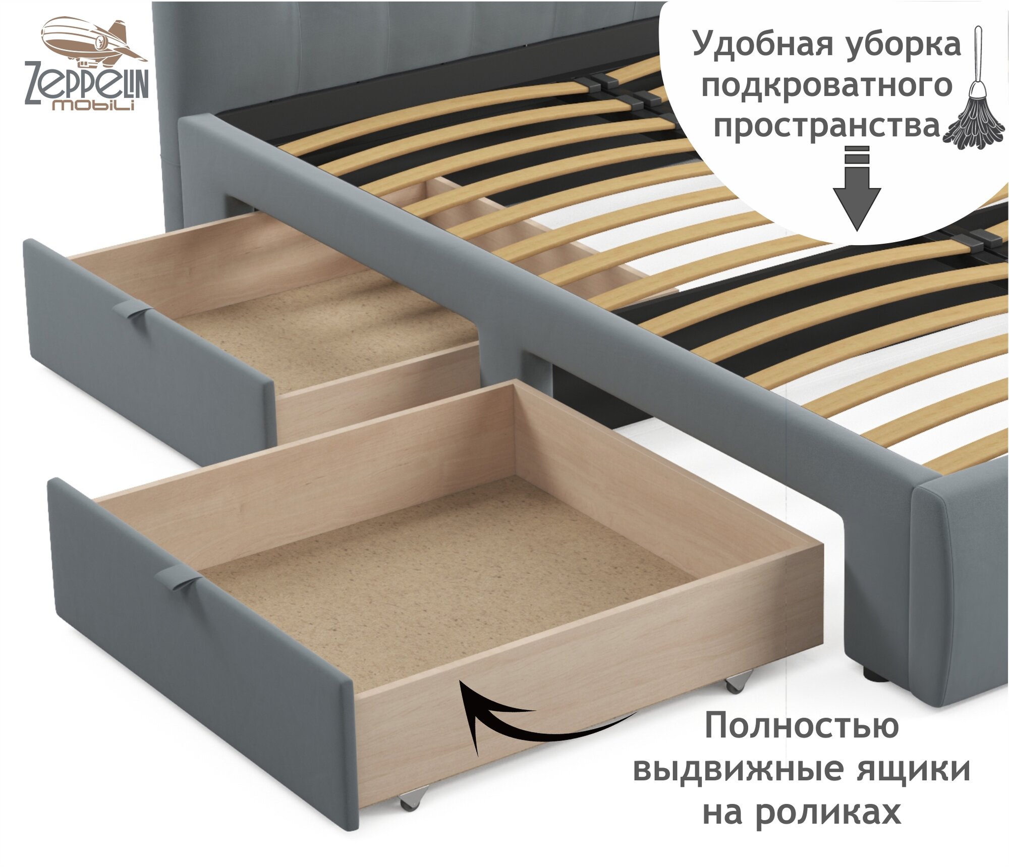 СохранитьДвуспальная кровать Verona 1600 серая Zeppelin с ящиками и ортопедическим основанием, 160х200, мягкая из велюра, ламели, выкатные ящики интересное: