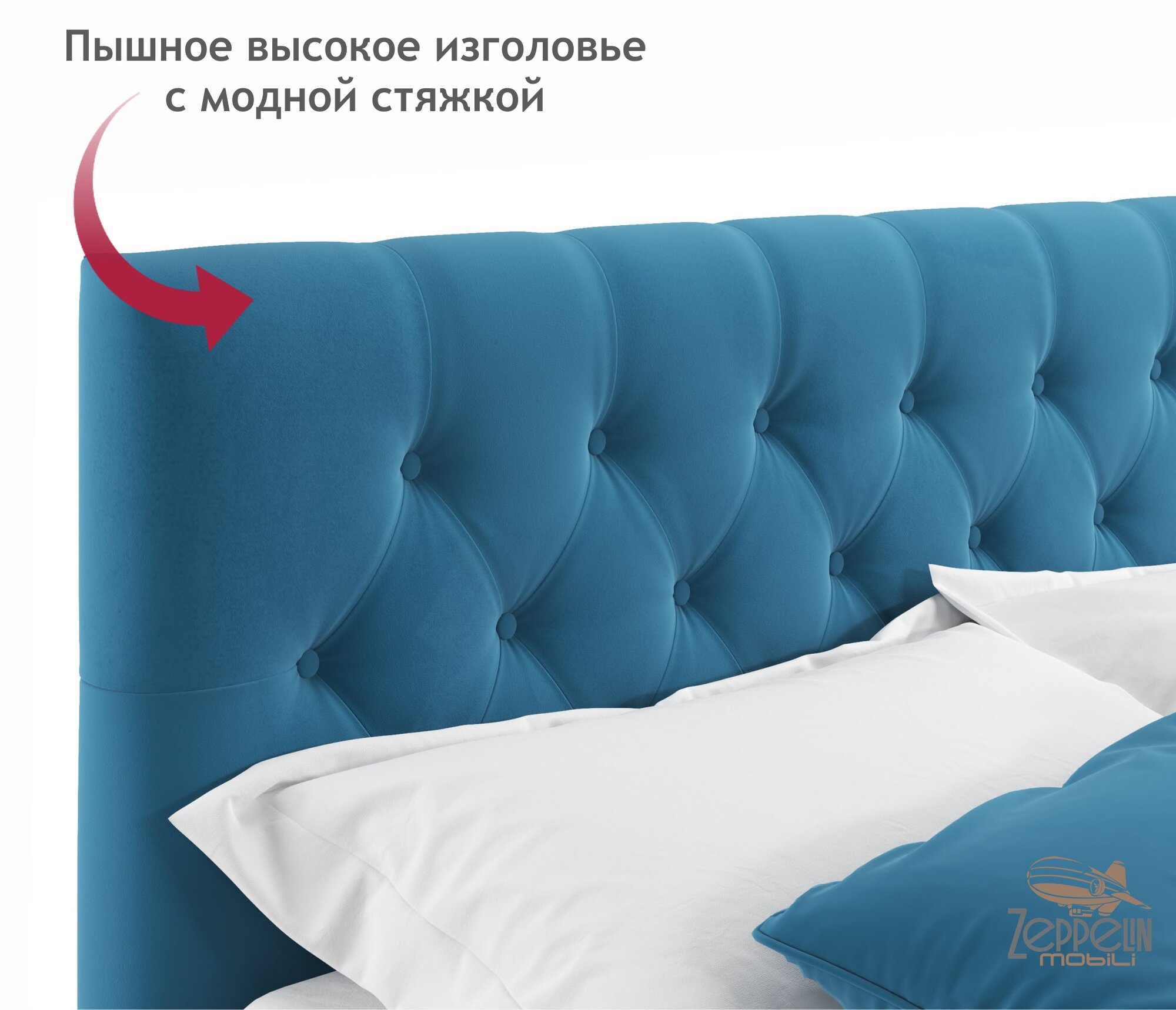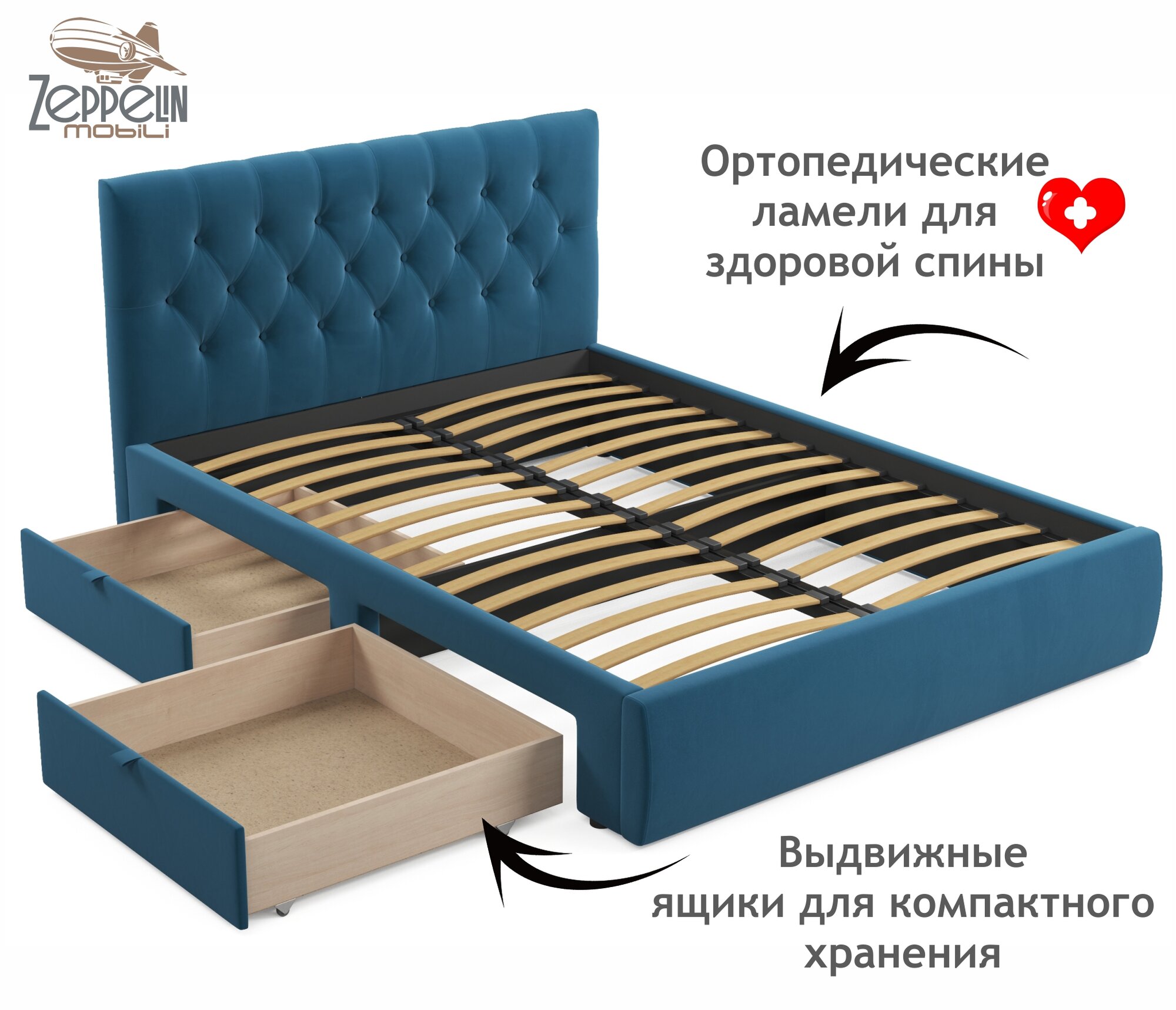 СохранитьДвуспальная кровать Verona 1600 синяя Zeppelin с ящиками и ортопедическим основанием, 160х200, мягкая из велюра, ламели, выкатные ящики интересное: