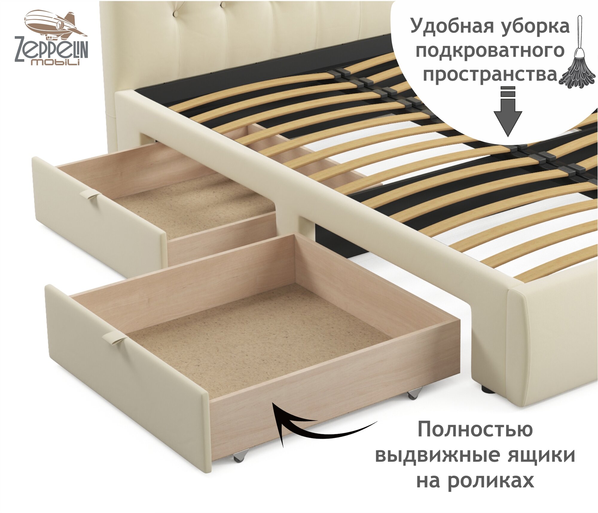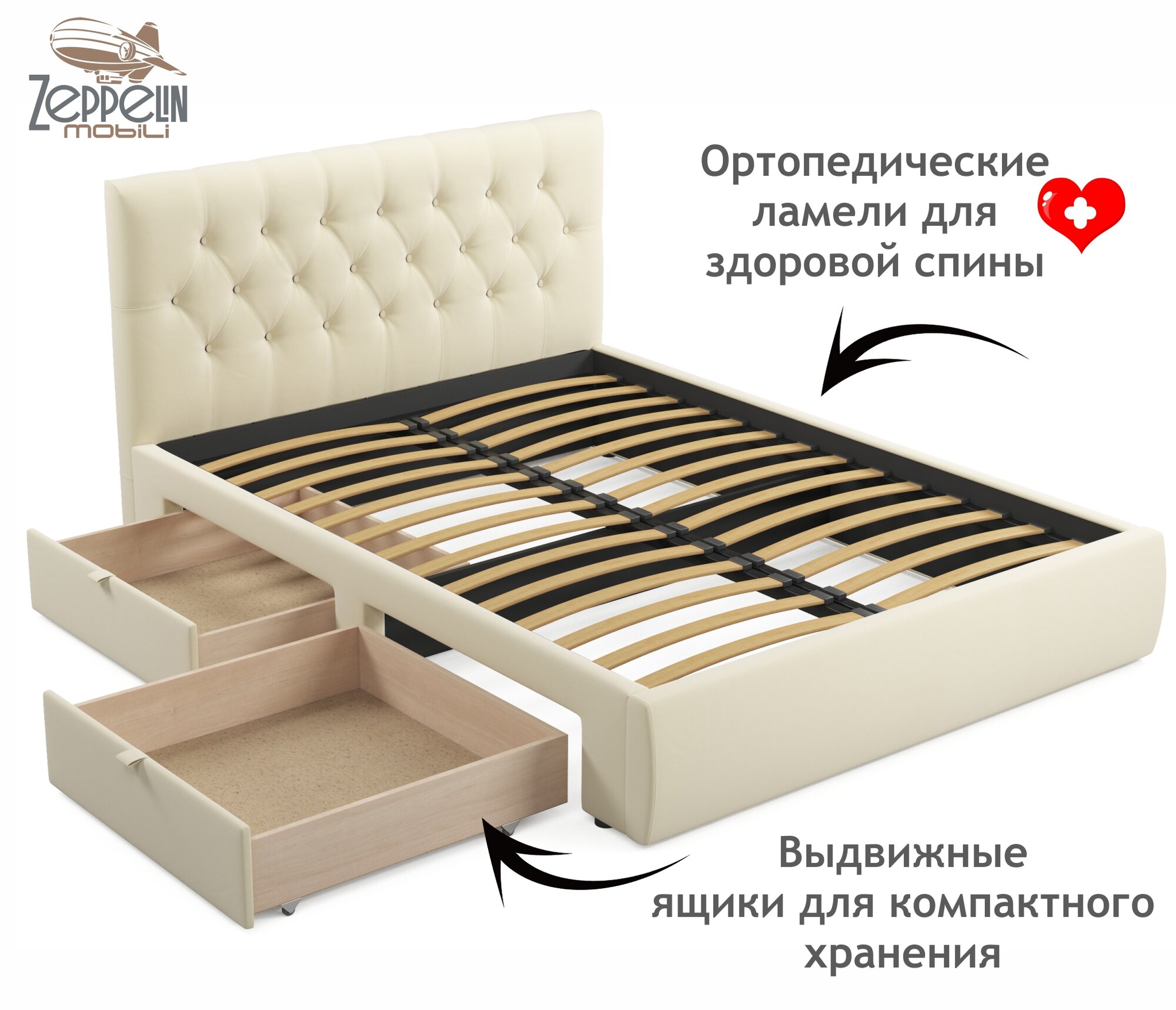 Купить Двуспальная кровать Verona 1600 бежевая Zeppelin с ящиками и ортопедическим основанием, 160х200, мягкая из велюра, ламели, выкатные ящики