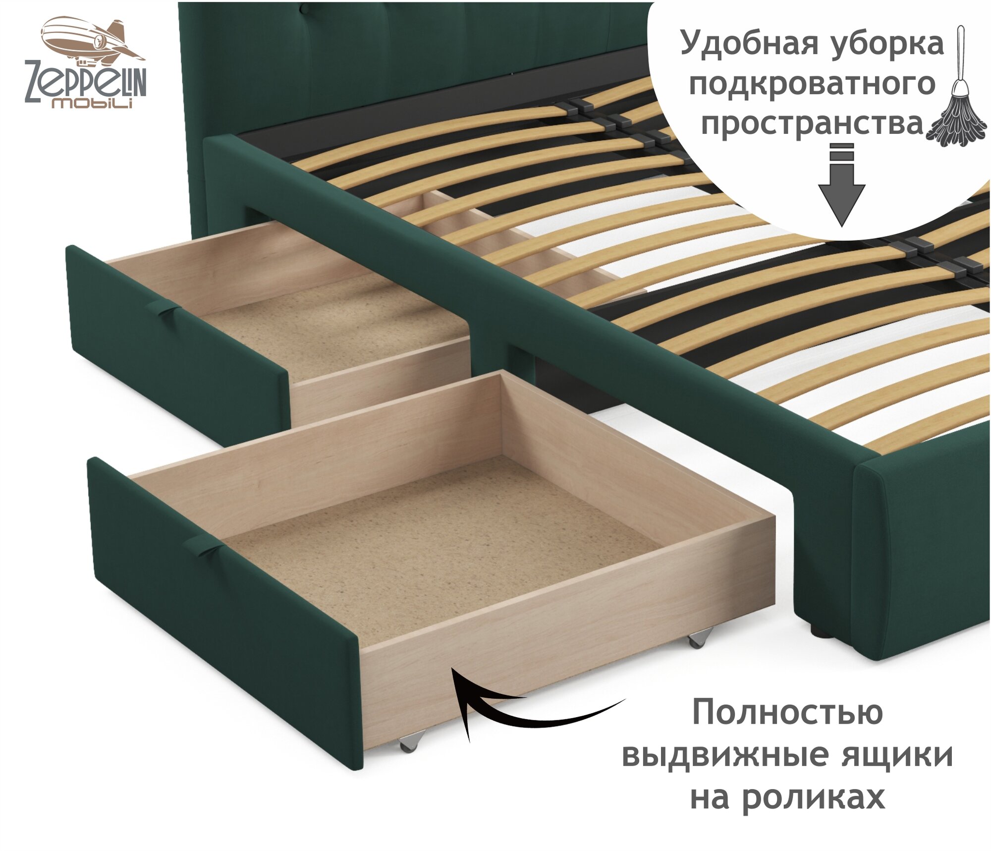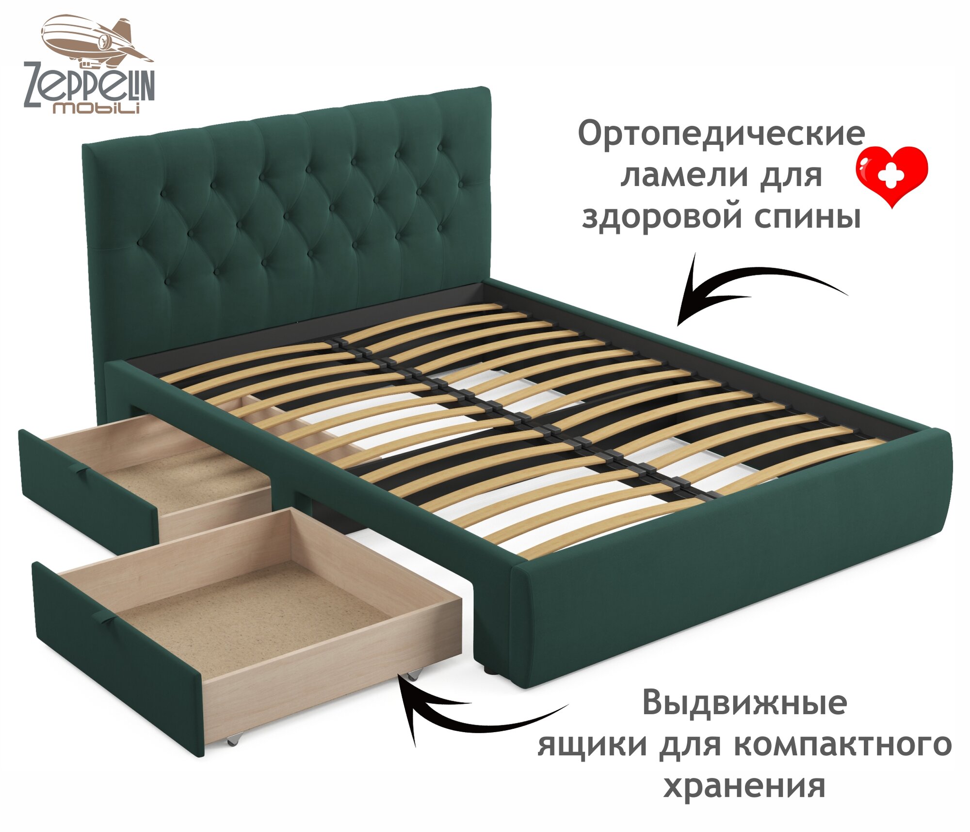 Купить Двуспальная кровать Verona 1600 изумруд Zeppelin с ящиками и ортопедическим основанием, 160х200, мягкая из велюра, ламели, выкатные ящики